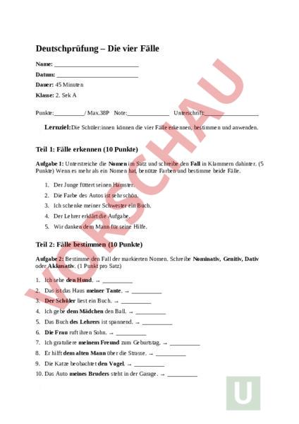 Deutschprüfung – Die vier Fälle Name: Datum: Dauer: 45 Minuten Klasse: 2. Sek Punkte:/ Max.38P Note: Unterschrift: Lernziel:Die Schüler:innen können die vier Fälle erkennen, bestimmen und anwenden. Teil 1: Fälle erkennen (10 Punkte) Aufgabe 1: Unterstreiche die Nomen im Satz und schreibe den Fall in Klammern dahinter. (5 Punkte) Wenn es mehr als ein Nomen hat, benütze Farben und bestimme beide Fälle. 1. Der Junge füttert seinen Hamster. 2. Die Farbe des Autos ist sehr schön. 3. Ich schenke meiner Schwester ein Buch. 4. Der Lehrer erklärt die Aufgabe. 5. Wir danken dem Mann für seine Hilfe. Teil 2: Fälle bestimmen (10 Punkte) Aufgabe 2: Bestimme den Fall der markierten Nomen. Schreibe Nominativ, Genitiv, Dativ oder Akkusativ. (1 Punkt pro Satz) 1. Ich sehe den Hund. 2. Das ist das Haus meiner Tante. 3. Der Schüler liest ein Buch. 4. Ich gebe dem Mädchen den Ball. 5. Das Buch des Lehrers ist spannend. 6. Die Frau ruft ihren Sohn. 7. Ich gratuliere meinem Freund zum Geburtstag. 8. Er hilft dem alten Mann über die Strasse. 9. Die Katze beobachtet den Vogel. 10. Das Auto meines Bruders steht in der Garage. Teil 3: Fälle anwenden (12 Punkte) Aufgabe 3a: Ergänze den Satz mit dem passenden Artikel und bestimme den Fall. (6 Punkte) 1. Ich gebe Frau einen Brief. 2. Das ist das Buch von Schüler. 3. Wir besuchen Grossvater. 4. Der Ball gehört Kind. 5. Lehrer erklärt die Grammatik. 6. Die Tasche Mutter ist blau. Aufgabe 3b: Wandle die Sätze vom Nominativ in den Akkusativ um. (6 Punkte) 1. Der Mann Ich treffe . 2. Die Frau Ich sehe . 3. Das Kind Ich besuche . 4. Die Katzen Ich füttere . 5. Der Lehrer Ich höre . 6. Das Auto Ich wasche . Teil 4: Kreatives Schreiben mit Fällen (6P) Schreibe eine kurze Detektivgeschichte über deinen Detektiv, der einen neuen Fall löst. Verwende dabei bewusst mindestens 6 Nomen in verschiedenen Fällen und markiere diese fett. Achte darauf, dass du insgesamt alle vier Fälle verwendest.