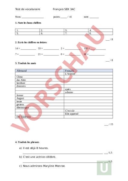 Test de vocabulaire Français SEK 3AC Nom: points:_ 41 note: 1. Note les bons chiffres 1. 5. 2. 6. 3. 7. 4. 8. 8 2. Ecris les chiffres en lettres 14 33 2 100 7 60 21 0 8 3. Traduis les mots Allemand Français Lhistoire China das Alter berühmt draussen après admirer Januar August heute gestern übermorgen Cest sûr Elle apprend Die Studentin 15 4. Traduis les phrases a) Il est déjà 8 heures. /1,5 b) Cest une actrice célèbre. /1,5 c) Nous admirons Maryline Monroe. Test de vocabulaire Français SEK 3AC /1,5 d) Jaime lire des livres. /1,5 5. On est quel jour de la semaine? a) Aujourdhui nous sommes ./ 1 b) Le jour après mercredi sappelle ./1,5 c) Le premier jour du week-end est . 1,5 Punkte 39 – 41 35 – 38 31 – 34 27 – 30 23 – 26 19 – 22 15 – 18 11 – 14 7 – 10 3–6 0-2 Note 6 5,5 5 4,5 4 3.5 3 2,5 2 1.5 1/
