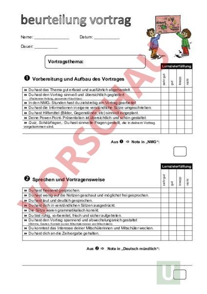 Name: Datum: Dauer: Vortragsthema: nicht knapp gut Vorbereitung und Aufbau des Vortrages sehr gut Lernzielerfülllung 8 Du hast das Thema gut erfasst und ausführlich abgehandelt. 8 Du hast den Vortrag sinnvoll und übersichtlich gegliedert (Packender Anfang, passender Abschluss) 8 In den NMG- Stunden hast du zielstrebig am Vortrag gearbeitet. 8 Du hast die Informationen in eigene verständliche Sätze umgeschrieben. 8 Du hast Hilfsmittel (Bilder, Gegenstände, etc) sinnvoll eingeplant. 8 Deine Power-Point- Präsentation ist übersichtlich und schön gestaltet. 8 Quiz, Schätzfragen,: Du hast sinnvolle Fragen gestellt, die in deinem Vortrag vorgekommen sind. Aus Note in „NMG: 8 Du hast fliessend gesprochen. 8 Du hast wenig auf die Notizen geschaut und möglichst frei gesprochen. 8 Du hast laut und deutlich gesprochen. 8 Du hast dich in verständlichen Sätzen ausgedrückt. 8 Die Sätze waren grammatikalisch korrekt. 8 Du bist ruhig, vorbereitet, frisch und sicher aufgetreten. 8 Du hast den Vortrag spannend und abwechslungsreich gestaltet (Stimme, Gesten, Kontakt zu den Mitschülerninnen und Mitschülern). 8 Du konntest das Interesse deiner Mitschülerinnen und Mitschüler wecken. 8 Du hast dich an die Zeitvorgabe gehalten. Aus Note in „Deutsch mündlich: nicht knapp gut Sprechen und Vortragensweise sehr gut Lernzielerfülllung