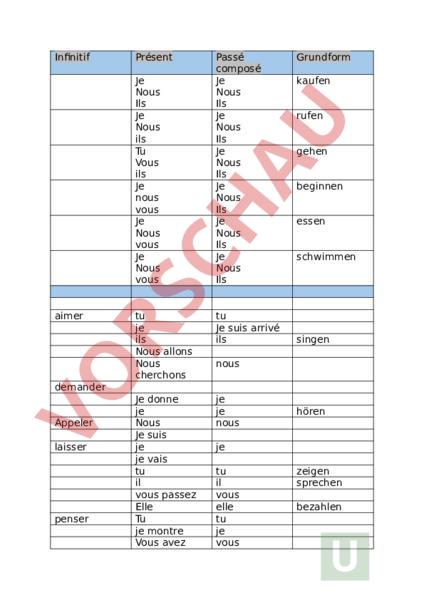 Infinitif Présent Je Nous Ils Je Nous ils Tu Vous ils Je nous vous Je Nous vous Je Nous vous aimer Passé composé Je Nous Ils Je Nous Ils Je Nous Ils Je Nous Ils Je Nous Ils Je Nous Ils tu je ils Nous allons Nous cherchons tu Je suis arrivé ils Je donne je Nous Je suis je je vais tu il vous passez Elle Tu je montre Vous avez je je nous Grundform kaufen rufen gehen beginnen essen schwimmen singen nous demander Appeler laisser penser hören je tu il vous elle tu je vous zeigen sprechen bezahlen Infinitif Présent Infinitif ils regardent Nous rentrons ils restent tu Je Présent Acheter Commencer Vous trouvez Il Il vas vous Ils ont Ils vont Ils sont Nous Jappelle Nous Passé composé ils nous ils tu je Passé composé vous Il il vous Grundform nous je Nous Schwimmen arbeiten zurückgeben Grundform sein