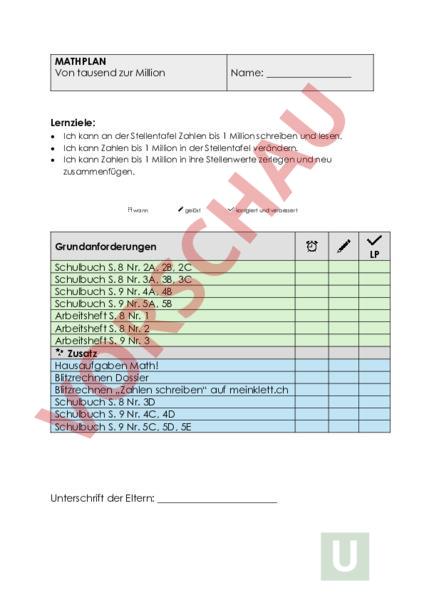 MATHPLAN Von tausend zur Million Name: Lernziele: • • • Ich kann an der Stellentafel Zahlen bis 1 Million schreiben und lesen. Ich kann Zahlen bis 1 Million in der Stellentafel verändern. Ich kann Zahlen bis 1 Million in ihre Stellenwerte zerlegen und neu zusammenfügen. wann gelöst korrigiert und verbessert Grundanforderungen Schulbuch S. 8 Nr. 2A, 2B, 2C Schulbuch S. 8 Nr. 3A, 3B, 3C Schulbuch S. 9 Nr. 4A, 4B Schulbuch S. 9 Nr. 5A, 5B Arbeitsheft S. 8 Nr. 1 Arbeitsheft S. 8 Nr. 2 Arbeitsheft S. 9 Nr. 3 Zusatz Hausaufgaben Math! Blitzrechnen Dossier Blitzrechnen „Zahlen schreiben auf meinklett.ch Schulbuch S. 8 Nr. 3D Schulbuch S. 9 Nr. 4C, 4D Schulbuch S. 9 Nr. 5C, 5D, 5E Unterschrift der Eltern: LP