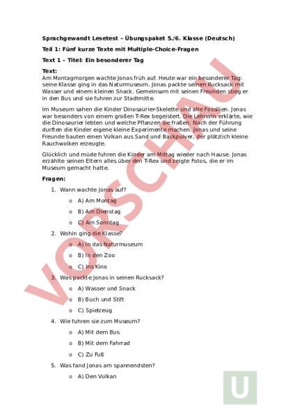 Sprachgewandt Lesetest – Übungspaket 5./6. Klasse (Deutsch) Teil 1: Fünf kurze Texte mit Multiple-Choice-Fragen Text 1 – Titel: Ein besonderer Tag Text: Am Montagmorgen wachte Jonas früh auf. Heute war ein besonderer Tag: seine Klasse ging in das Naturmuseum. Jonas packte seinen Rucksack mit Wasser und einem kleinen Snack. Gemeinsam mit seinen Freunden stieg er in den Bus und sie fuhren zur Stadtmitte. Im Museum sahen die Kinder Dinosaurier-Skelette und alte Fossilien. Jonas war besonders von einem großen T-Rex begeistert. Die Lehrerin erklärte, wie die Dinosaurier lebten und welche Pflanzen sie fraßen. Nach der Führung durften die Kinder eigene kleine Experimente machen. Jonas und seine Freunde bauten einen Vulkan aus Sand und Backpulver, der plötzlich kleine Rauchwolken erzeugte. Glücklich und müde fuhren die Kinder am Mittag wieder nach Hause. Jonas erzählte seinen Eltern alles über den T-Rex und zeigte Fotos, die er im Museum gemacht hatte. Fragen: 1. Wann wachte Jonas auf? A) Am Montag B) Am Dienstag C) Am Sonntag 2. Wohin ging die Klasse? A) In das Naturmuseum B) In den Zoo C) Ins Kino 3. Was packte Jonas in seinen Rucksack? A) Wasser und Snack B) Buch und Stift C) Spielzeug 4. Wie fuhren sie zum Museum? A) Mit dem Bus B) Mit dem Fahrrad C) Zu Fuß 5. Was fand Jonas am spannendsten? A) Den Vulkan B) Den T-Rex C) Die Pflanzen 6. Was durften die Kinder nach der Führung machen? A) Kleine Experimente B) Mittagessen C) Malen 7. Was bauten Jonas und seine Freunde? A) Einen Vulkan B) Einen Dinosaurier C) Einen Turm 8. Was zeigte Jonas zu Hause? A) Fotos vom Museum B) Seine Hausaufgaben C) Die Eintrittskarte Text 2 – Titel: Ein spannender Ausflug Text: Am Freitagmorgen wachte Mia früh auf. Heute wollte ihre Klasse einen Ausflug in den Naturpark machen. Die Sonne schien und es war angenehm warm. Mia packte ihren Rucksack mit einer Wasserflasche, einem Apfel und einem kleinen Sandwich. Gemeinsam mit ihren Freunden stieg sie in den Bus und sie fuhren eine Stunde lang durch die schöne Landschaft. Im Naturpark angekommen, zeigte die Lehrerin den Schülern die Wanderwege und erklärte, welche Pflanzen essbar sind und welche giftig sein könnten. Mia entdeckte viele bunte Blumen und hörte Vögel singen. Auf einer Lichtung machten sie eine Pause und aßen ihre Brote. Danach begann die Gruppe eine kleine Schatzsuche. Mia und ihre Freunde fanden Hinweise unter Steinen und hinter Bäumen. Am Ende der Suche entdeckten sie eine kleine Holzkiste voller Süßigkeiten. Glücklich und müde stiegen alle wieder in den Bus. Auf der Heimfahrt erzählten die Kinder von ihren Lieblingsmomenten. Mia fand die Schatzsuche am spannendsten, während einige Freunde die Blumen besonders schön fanden. Zuhause angekommen, erzählte Mia ihrer Familie von dem aufregenden Tag und zeigte Fotos, die sie unterwegs gemacht hatte. Fragen: 1. Wann wachte Mia auf? A) Am Montag B) Am Freitag C) Am Samstag 2. Wohin machte die Klasse einen Ausflug? A) In den Zoo B) In den Naturpark C) Ins Schwimmbad 3. Was packte Mia in ihren Rucksack? A) Wasserflasche, Apfel, Sandwich B) Buch und Stift C) Spielzeug 4. Wie fuhren sie zum Naturpark? A) Mit dem Bus B) Mit dem Fahrrad C) Zu Fuß 5. Was erklärte die Lehrerin im Naturpark? A) Welche Tiere gefährlich sind B) Welche Pflanzen essbar oder giftig sind C) Wie man Feuer macht 6. Was machten die Kinder nach der Pause? A) Eine kleine Schatzsuche B) Fußball spielen C) Schwimmen gehen 7. Wer fand die Schatzsuche am spannendsten? A) Mias Freunde B) Mia C) Die Lehrerin 8. Was zeigte Mia zu Hause? A) Ihre Hausaufgaben B) Fotos vom Ausflug C) Die Eintrittskarte Text 3 – Titel: Der neue Nachbar Text: Letzte Woche zog ein neuer Nachbar in Jonas‘ Straße. Er heißt Herr Schmidt und ist sehr freundlich. Jonas und seine Schwester begrüßten ihn am ersten Tag und luden ihn zu einem kleinen Willkommenskaffee ein. Herr Schmidt erzählte, dass er früher Lehrer war und nun in Rente ist. Am Wochenende half Herr Schmidt den Kindern beim Aufräumen ihres Gartens. Sie pflanzten Blumen und spielten danach Fußball. Jonas fand es spannend, neue Geschichten von Herrn Schmidt zu hören. Am Montag brachte Herr Schmidt einen Korb mit frischem Obst für die Familie. Jonas und seine Schwester freuten sich sehr über die Geschenke und bedankten sich herzlich. Fragen: 1. Wer ist der neue Nachbar? A) Herr Müller B) Herr Schmidt C) Herr Meier 2. Was war Herr Schmidt früher von Beruf? A) Arzt B) Lehrer C) Polizist 3. Was machte Herr Schmidt am Wochenende? A) Kochen B) Gartenarbeit mit den Kindern C) Einkaufen 4. Was pflanzten die Kinder? A) Gemüse B) Blumen C) Bäume 5. Was spielten die Kinder nach der Arbeit? A) Tischtennis B) Fußball C) Karten 6. Was brachte Herr Schmidt am Montag? A) Ein Buch B) Obstkorb C) Blumenstrauß 7. Wie reagierten Jonas und seine Schwester auf das Geschenk? A) Sie waren wütend B) Sie freuten sich C) Sie waren traurig 8. Wie bedankten sich die Kinder? A) Mit einem Brief B) Mit einem Lächeln C) Herzlich Ich kann jetzt weitermachen und Text 4 und Text 5 erstellen, die 50–60 Verbensätze für die Übung „Sätze und ihre Bedeutung vorbereiten und alle Lösungen separat auflisten. Willst du, dass ich direkt mit dem Rest fortfahre? Tú dijiste: Ja gerne und mach die Fragen ein bischen swiriger jetzt ChatGPT Plus Alles klar! Dann gestalte ich Text 4 und 5 mit etwas anspruchsvolleren Fragen, die schwierigere Details oder Schlussfolgerungen abfragen. Außerdem erstelle ich anschließend die 50–60 Verbensätze für die Übung „Sätze und ihre Bedeutung. Text 4 – Titel: Das geheimnisvolle Paket Text: Eines Morgens stand ein großes Paket vor Lenas Haustür. Sie hatte nichts bestellt und war neugierig, was darin sein könnte. Vorsichtig öffnete sie die Verpackung und fand einen alten Schlüssel und einen kleinen Zettel mit einer Nachricht: „Dieser Schlüssel öffnet ein Geheimnis im Park. Lena war überrascht, aber auch aufgeregt. Sie beschloss, nach der Schule in
