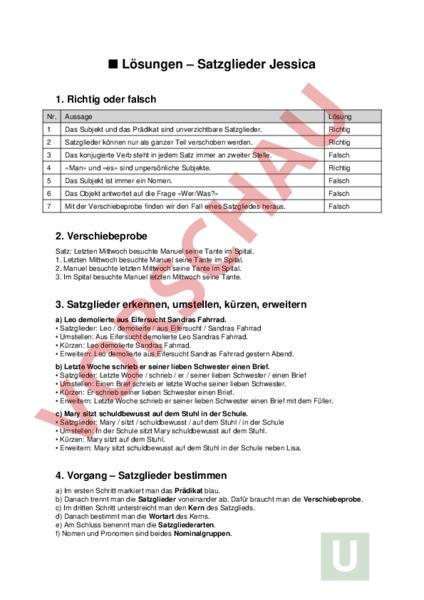 Lösungen – Satzglieder Jessica 1. Richtig oder falsch Nr. Aussage Lösung 1 Das Subjekt und das Prädikat sind unverzichtbare Satzglieder. Richtig 2 Satzglieder können nur als ganzer Teil verschoben werden. Richtig 3 Das konjugierte Verb steht in jedem Satz immer an zweiter Stelle. Falsch 4 «Man» und «es» sind unpersönliche Subjekte. Richtig 5 Das Subjekt ist immer ein Nomen. Falsch 6 Das Objekt antwortet auf die Frage «Wer/Was?» Falsch 7 Mit der Verschiebeprobe finden wir den Fall eines Satzgliedes heraus. Falsch 2. Verschiebeprobe Satz: Letzten Mittwoch besuchte Manuel seine Tante im Spital. 1. Letzten Mittwoch besuchte Manuel seine Tante im Spital. 2. Manuel besuchte letzten Mittwoch seine Tante im Spital. 3. Im Spital besuchte Manuel letzten Mittwoch seine Tante. 3. Satzglieder erkennen, umstellen, kürzen, erweitern a) Leo demolierte aus Eifersucht Sandras Fahrrad. • Satzglieder: Leo demolierte aus Eifersucht Sandras Fahrrad • Umstellen: Aus Eifersucht demolierte Leo Sandras Fahrrad. • Kürzen: Leo demolierte Sandras Fahrrad. • Erweitern: Leo demolierte aus Eifersucht Sandras Fahrrad gestern Abend. b) Letzte Woche schrieb er seiner lieben Schwester einen Brief. • Satzglieder: Letzte Woche schrieb er seiner lieben Schwester einen Brief • Umstellen: Einen Brief schrieb er letzte Woche seiner lieben Schwester. • Kürzen: Er schrieb seiner lieben Schwester einen Brief. • Erweitern: Letzte Woche schrieb er seiner lieben Schwester einen Brief mit dem Füller. c) Mary sitzt schuldbewusst auf dem Stuhl in der Schule. • Satzglieder: Mary sitzt schuldbewusst auf dem Stuhl in der Schule • Umstellen: In der Schule sitzt Mary schuldbewusst auf dem Stuhl. • Kürzen: Mary sitzt auf dem Stuhl. • Erweitern: Mary sitzt schuldbewusst auf dem Stuhl in der Schule neben Lisa. 4. Vorgang – Satzglieder bestimmen a) Im ersten Schritt markiert man das Prädikat blau. b) Danach trennt man die Satzglieder voneinander ab. Dafür braucht man die Verschiebeprobe. c) Im dritten Schritt unterstreicht man den Kern des Satzglieds. d) Danach bestimmt man die Wortart des Kerns. e) Am Schluss benennt man die Satzgliederarten. f) Nomen und Pronomen sind beides Nominalgruppen. 5. Satzglieder erkennen und bestimmen 1. Leonie und Lara gehen seit sieben Jahren in dieselbe Klasse. Subjekt: Leonie und Lara Prädikat: gehen Adv. Zeit: seit sieben Jahren PO/Adv. Ort: in dieselbe Klasse 2. Der Onkel von Marcus isst am Abend eine feine Lasagne. Subjekt: Der Onkel von Marcus Prädikat: isst Adv. Zeit: am Abend AO: eine feine Lasagne 3. Gestern fand Anna die kleine Katze auf dem Gehsteig. Adv. Zeit: Gestern Prädikat: fand Subjekt: Anna AO: die kleine Katze PO/Adv. Ort: auf dem Gehsteig 4. Karl muss das Paket schnell auf der Post abgeben. Subjekt: Karl Prädikat: muss abgeben AO: das Paket Adv. Art: schnell Adv. Ort: auf der Post 6. Satzglieder bestimmen 1. Am Morgen spazierte ich mit meinem Hund im Wald. Sich Pspazierte POmit meinem Hund POim Wald 2. Heute wird Fiona zum ersten Mal ihre Tante in ihrer neuen Wohnung besuchen. SFiona Pwird besuchen AOihre Tante POin ihrer neuen Wohnung 3. Auf dem Spielplatz hat Nils seine Freunde getroffen. POauf dem Spielplatz SNils AOseine Freunde Phat getroffen 4. Ihr nehmt euch seiner zu wenig an. Sihr Pnehmt an DOeuch GOseiner 5. Wir haben ihn sehr lange gesucht. Swir Phaben gesucht AOihn Adv.sehr lange 6. Sie bringen den Patienten das Essen. Ssie Pbringen DOden Patienten AOdas Essen