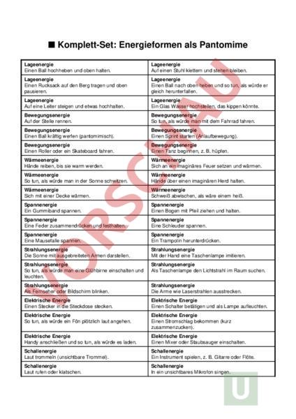 Komplett-Set: Energieformen als Pantomime Lageenergie Einen Ball hochheben und oben halten. Lageenergie Auf einen Stuhl klettern und stehen bleiben. Lageenergie Einen Rucksack auf den Berg tragen und oben pausieren. Lageenergie Einen Ball nach oben heben und so tun, als würde er gleich herunterfallen. Lageenergie Auf eine Leiter steigen und etwas hochhalten. Lageenergie Ein Glas Wasser hochstellen, das kippen könnte. Bewegungsenergie Auf der Stelle rennen. Bewegungsenergie So tun, als würde man mit dem Fahrrad fahren. Bewegungsenergie Einen Ball kräftig werfen (pantomimisch). Bewegungsenergie Einen Sprint starten (Anlaufbewegung). Bewegungsenergie Einen Roller oder ein Skateboard fahren. Bewegungsenergie Einen Tanz beginnen, z. B. hüpfen. Wärmeenergie Hände reiben, bis sie warm werden. Wärmeenergie Sich an ein imaginäres Feuer setzen und wärmen. Wärmeenergie So tun, als würde man in der Sonne schwitzen. Wärmeenergie Hände über einen imaginären Herd halten. Wärmeenergie Sich mit einer Decke wärmen. Wärmeenergie Schweiß abwischen, als wäre einem heiß. Spannenergie Ein Gummiband spannen. Spannenergie Einen Bogen mit Pfeil ziehen und halten. Spannenergie Eine Feder zusammendrücken und festhalten. Spannenergie Eine Schleuder spannen. Spannenergie Eine Mausefalle spannen. Spannenergie Ein Trampolin herunterdrücken. Strahlungsenergie Die Sonne mit ausgebreiteten Armen darstellen. Strahlungsenergie Mit der Hand eine Taschenlampe imitieren. Strahlungsenergie So tun, als würde man eine Glühbirne einschalten und leuchten. Strahlungsenergie Als Taschenlampe den Lichtstrahl im Raum suchen. Strahlungsenergie Als Fernseher oder Bildschirm blinken. Strahlungsenergie Die Arme wie Laserstrahlen ausstrecken. Elektrische Energie Einen Stecker in die Steckdose stecken. Elektrische Energie Einen Schalter betätigen und als Lampe aufleuchten. Elektrische Energie So tun, als würde ein Fön plötzlich laut angehen. Elektrische Energie Einen Stromschlag bekommen (kurz zusammenzucken). Elektrische Energie Handy anschließen und so tun, als würde es laden. Elektrische Energie Einen Mixer oder Staubsauger einschalten. Schallenergie Laut trommeln (unsichtbare Trommel). Schallenergie Ein Instrument spielen, z. B. Gitarre oder Flöte. Schallenergie Laut rufen oder klatschen. Schallenergie In ein unsichtbares Mikrofon singen. Schallenergie Ein Feuerwerk imitieren („Peng!). Schallenergie Mit unsichtbaren Kopfhörern Musik hören und vibrieren. Chemische Energie Einen Apfel essen und dann voller Kraft aufspringen. Chemische Energie So tun, als würde ein Auto betankt und losfahren. Chemische Energie Ein Stück Schokolade essen und plötzlich aktiv werden. Chemische Energie Kaugummi essen und danach voller Energie springen. Chemische Energie Eine Kerze anzünden, die brennt (chemische Reaktion). Chemische Energie Ein Auto fährt los, nachdem es Benzin bekommen hat.