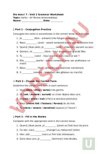 Dis donc! 7 – Unit 1 Grammar Worksheet Topic: Verbs – All Tenses (Intermediate) Name: Date: