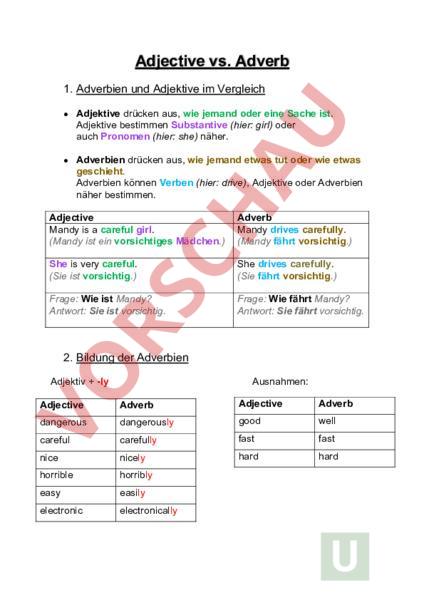 Adjective vs. Adverb 1. Adverbien und Adjektive im Vergleich • Adjektive drücken aus, wie jemand oder eine Sache ist. Adjektive bestimmen Substantive (hier: girl) oder auch Pronomen (hier: she) näher. • Adverbien drücken aus, wie jemand etwas tut oder wie etwas geschieht. Adverbien können Verben (hier: drive), Adjektive oder Adverbien näher bestimmen. Adjective Mandy is careful girl. (Mandy ist ein vorsichtiges Mädchen.) Adverb Mandy drives carefully. (Mandy fährt vorsichtig.) She is very careful. (Sie ist vorsichtig.) She drives carefully. (Sie fährt vorsichtig.) Frage: Wie ist Mandy? Antwort: Sie ist vorsichtig. Frage: Wie fährt Mandy? Antwort: Sie fährt vorsichtig. 2. Bildung der Adverbien Adjektiv -ly Ausnahmen: Adjective Adverb Adjective Adverb dangerous dangerously good well careful carefully fast fast nice nicely hard hard horrible horribly easy easily electronic electronically