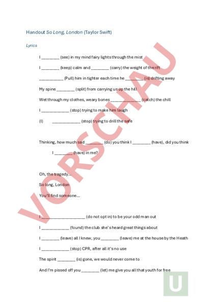 Arbeitsblatt: Song So Long London Taylor Swift Past Simple Irregular