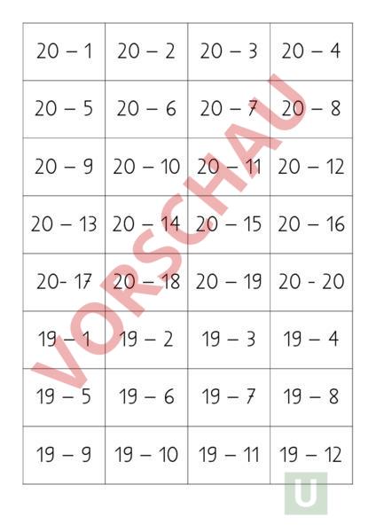 Karteikarten mit allen Minusrechnungen im Zahlenraum bis 20.