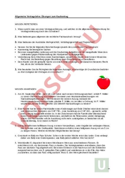 Allgemeine Vertragslehre: Übungen zum Kaufvertrag WISSEN REPETIEREN 1. Wann spricht man von einer Vertragsverletzung, und welches ist die allgemeine Rechtswirkung bei Vertragsverletzung durch den Schuldner? 2. Was bedeutet ganz allgemein der rechtliche Fachausdruck Verzug? 3. Was bedeuten die Ausdrücke Mahngeschäft, Verfalltagsgeschäft und Fixgeschäft? 4. Nennen Sie für die folgenden Beschreibungen jeweils den zutreffenden Fachausdruck: · Kaufvertrag für bewegliche Sachen · Bei einer mangelhaften Lieferung wird der Kaufvertrag aufgelöst und die mangelhafte Ware dem Lieferanten gegen Rückerstattung des Kaufpreises zurückgegeben. · Vereinbarung beim Abschluss eines Kaufvertrages, wonach der Käufer innert einem Monat das Recht hat, die Bestellung gegen Bezahlung einer Entschädigung zu annullieren. · Dem Käufer wird die gekaufte Sache von einem Dritten entzogen, der darauf ein besseres Recht hat, als es der Verkäufer besass. 1. Wie beurteilen Sie die Richtigkeit der folgenden Aussage: Kaufverträge für Grundstücke bedürfen zu ihrer Gültigkeit der Eintrages ins Grundbuch WISSEN ANWENDEN 1. Am 26. September 1999 mehr als zwei Jahre nach seinem Wohnungswechsel erhält P. Müller zu seiner Überraschung vom früheren Vermieter zwei Heizkostenabrechnungen mit Nachzahlungsforderungen. Weil seinerzeit bei seinem Auszug niemand die Heizkostenrechnung erwähnt hatte, glaubte P. Müller, es sei alles in Ordnung. Ist P. Müller verpflichtet, für die Winter 1993/94 und 1994/95 Nachzahlungen zu leisten? 2. Eine Familie hat bei einem Fachhändler einen Kinderwagen auf Ende Oktober reservieren lassen und dafür auf den Kaufpreis von CHF 750.-- eine Anzahlung von CHF 100.-- gemacht, wofür eine Quittung ausgestellt worden ist. In der Zwischenzeit hat die Familie aber überraschend einen Kinderwagen geschenkt bekommen, weshalb sie die Reservation wieder rückgängig macht. Der Fachhändler will die Anzahlung nicht mehr zurückgeben, er betrachtet sie als Unkostenbeitrag. Ist er damit im Recht? 3. Georg bestellt einen hellblauen Anzug in einem Versandhaus, unter Angabe der verlangten Masse, des Schnittes und der Stoffqualität. Statt dessen erhält er einen hellgrauen Anzug mit um 5 cm zu langen Hosen. Welche rechtlichen Möglichkeiten hat Georg? 4. Gina kauft im Bally ein Paar Schuhe. Schon in der ersten Woche reisst das Leder. Gina verlangt daher von Bally eine Gratisreparatur, was Bally jedoch ablehnt. Wer hat recht? 5. Weinhändler E. degustiert bei einem Weinbauern Wein aus verschiedenen Fässern. Er entschliesst sich, ein bestimmtes Fass zu kaufen. Die Vertragsparteien vereinbaren, dass das Fass am nächsten Tag abgeholt wird. Bei einem Einbruch in der Nacht tun sich die Einbrecher ausgerechnet an dem von E. gekauften Fass gütlich und unterlassen es in der Eile, den Hahn zuzudrehen, so dass das Fass völlig ausläuft. Muss E. den Wein gleichwohl bezahlen? cs