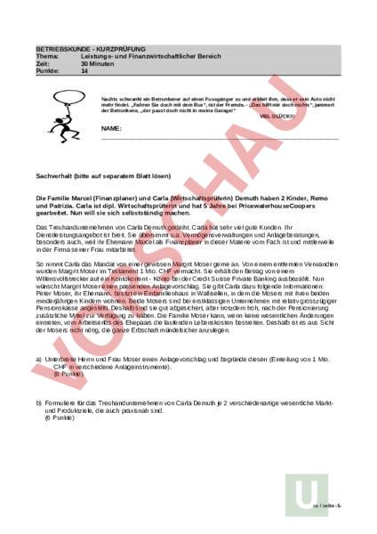 BETRIEBSKUNDE KURZPRÜFUNG Thema: Leistungs- und Finanzwirtschaftlicher Bereich Zeit: 30 Minuten Punkte: 14 Nachts schwankt ein Betrunkener auf einen Fussgänger zu und erklärt ihm, dass er sein Auto nicht mehr findet. „Fahren Sie doch mit dem Bus, rät der Fremde. „Das hilft mir doch nichts, jammert der Betrunkene, „der passt doch nicht in meine Garage! VIEL GLÜCK!!! NAME: Sachverhalt (bitte auf separatem Blatt lösen) Die Familie Marcel (Finanzplaner) und Carla (Wirtschaftsprüferin) Demuth haben 2 Kinder, Remo und Patrizia. Carla ist dipl. Wirtschaftsprüferin und hat 5 Jahre bei PricewaterhouseCoopers gearbeitet. Nun will sie sich selbstständig machen. Das Treuhandunternehmen von Carla Demuth gedeiht. Carla hat sehr viel gute Kunden. Ihr Dienstleistungsangebot ist breit. Sie übernimmt u.a. Vermögensverwaltungen und Anlageberatungen, besonders auch, weil ihr Ehemann Marcel als Finanzplaner in dieser Materie vom Fach ist und mittlerweile in der Firma seiner Frau mitarbeitet. So nimmt Carla das Mandat von einer gewissen Margrit Moser gerne an. Von einem entfernten Verwandten wurden Margrit Moser im Testament 1 Mio. CHF vermacht. Sie erhält den Betrag von einem Willensvollstrecker auf ein Kontokorrent Konto bei der Credit Suisse Private Banking ausbezahlt. Nun wünscht Margrit Moser einen passenden Anlagevorschlag. Sie gibt Carla dazu folgende Informationen: Peter Moser, ihr Ehemann, besitzt ein Einfamilienhaus in Wallisellen, in dem die Mosers mit ihren beiden minderjährigen Kindern wohnen. Beide Mosers sind bei erstklassigen Unternehmen mit relativ grosszügiger Pensionskasse angestellt. Deshalb sind sie gut abgesichert, aber trotzdem froh, nach der Pensionierung zusätzliche Mittel zur Verfügung zu haben. Die Familie Moser kann, wenn keine wesentlichen Änderungen eintreten, vom Arbeitserlös des Ehepaars die laufenden Lebenskosten bestreiten. Deshalb ist es aus Sicht der Mosers nicht nötig, die ganze Erbschaft mündelsicher anzulegen. a) Unterbreite Herrn und Frau Moser einen Anlagevorschlag und begründe diesen (Einteilung von 1 Mio. CHF in verschiedene Anlageinstrumente). (8 Punkte) b) Formuliere für das Treuhandunternehmen von Carla Demuth je 2 verschiedenartige wesentliche Marktund Produktziele, die auch praxisnah sind. (6 Punkte) cs seite -1-