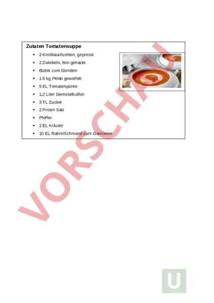 Zutaten Tomatensuppe 2 Knoblauchzehen, gepresst 2 Zwiebeln, fein gehackt Butter zum Dünsten 1.5 kg Pelati gewürfelt 5 EL Tomatenpüree 1,2 Liter Gemüsebuillon 3 TL Zucker 2 Prisen Salz Pfeffer 2 EL Kräuter 10 EL Rahm/Schmand zum Garnieren Tomatensuppe: Zutaten Rezept Rezept: 1. Knoblauch und Zwiebel in der Butter andünsten. 2. Tomatenpüree mitdünsten. 3. Mit Bouillon ablöschen 4. Zucker beifügen, würzen. 5. Zugedeckt 15-20 Minuten köcheln. 6. Suppe fein pürieren, in die Pfanne zurückgeben. 7. Erhitzen, Kräuter beifügen. 8. Tomatensuppe in vorgewärmte Teller verteilen 9. Garnieren. Kürbisrisotto: Mise en Place: Zutaten 1kg Kürbis 2 Zwiebeln 2 Zehen Knoblauch 30g Peterli 800g Risottoreis 5dl Weisswein 1.6l Bouillon 200g Parmesan Olivenöl 50g Butter Rezept: ZUBEREITUNG 1 Den Kürbis in 1 cm grosse Würfel schneiden. Die Zwiebel schälen und fein hacken und den Knoblauch pressen. 2 In einer grossen Pfanne Olivenöl und Butter erhitzen. Zwiebel und Knoblauch hineingeben und 2-3 Minuten andünsten. Dann den Reis beifügen und kurz mitrösten. Den Wein dazugiessen und unter Rühren vollständig vom Reis aufnehmen lassen. 3 Nun die Hälfte der Bouillon, die Kürbiswürfel und die Petersilie beifügen und den Reis auf kleinem Feuer leise kochen lassen, bis er die ganze Flüssigkeit aufgenommen hat. Dann die restliche Bouillon bis auf etwa 1/2 dl beifügen und den Risotto noch so lange kochen lassen, bis der Reis bissfest ist. Der Risotto soll eine leicht suppige Konsistenz haben; wenn nötig noch etwas Bouillon nachgiessen. 4 Zuletzt die beiseite gestellte Bouillon und den Parmesan untermischen und den Risotto mit Salz und Pfeffer abschmecken. Vom Feuer nehmen und zugedeckt noch 2 Minuten ruhen lassen, dann sofort servieren. Eierbrot: Mise en Place: Zutaten 20 Scheiben Brot 10 Eier Kräutersalz Pfeffer Rapsöl Rezept: ZUBEREITUNG 1 Die Eier in einer kleinen Schüssel aufschlagen. Die Eier einzeln nach dem Aufschlagen in eine mittlere Schüssel geben und eine Prise Salz hinzugeben. 2 In einer Pfanne Rapsöl erhitzen. 3 Die Brotscheiben nacheinander von beiden Seiten in das aufgeschlagene Ei tunken. 4 Die Brote in der heißen Pfanne 2-3min von beiden Seiten anbraten. 5 Die Brotscheiben danach zum Warmhalten und goldgelb ausbacken in den bei 120 vorgeheizten Backofen legen. Mailänderli-Guetzli: Mise en Place: Zutaten 250g Butter weich 225g Zucker 1 Prise Salz 4 frische Eier 1 Bio Zitrone 500g Mehl 1 TL Milch oder Rahm Rezept: ZUBEREITUNG 1 Butter in einer Schüssel verrühren. Zucker und Salz darunterrühren. Ein Ei nach dem andern bis 3 Eier!! darunterrühren, weiterrühren, bis die Masse heller ist. Von der Zitrone Schale abreiben, darunterrühren. 2 Mehl beigeben, zu einem Teig zusammenfügen, etwas flach drücken, zugedeckt kühl stellen. 3 Ofen auf 200 Grad vorheizen. 4 Teig portionenweise auf wenig Mehl ca. 7 mm dick auswallen. 5 Verschiedene Formen ausstechen, auf mit Backpapier belegte Bleche legen. Guetzli ca. 15 Min. kühl stellen. Eigelb und Milch verrühren, Guetzli damit bestreichen. 5 Backen: ca. 10 Min. in der Mitte des Ofens. Herausnehmen, Mailänderli auf einem Gitter auskühlen.