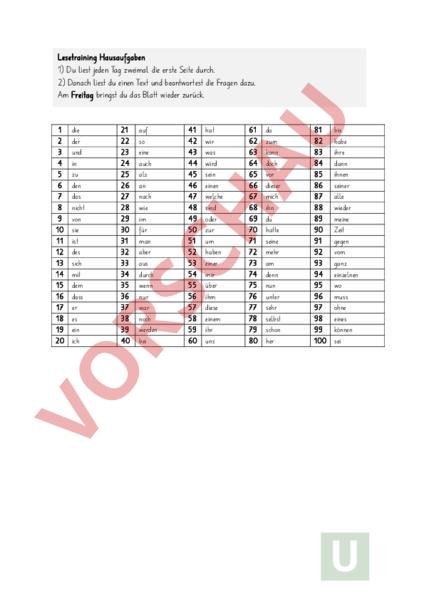 Lesetraining Hausaufgaben 1) Du liest jeden Tag zweimal die erste Seite durch. 2) Danach liest du einen Text und beantwortest die Fragen dazu. Am Freitag bringst du das Blatt wieder zurück. 1 2 3 4 5 6 7 8 9 10 11 12 13 14 15 16 17 18 19 20 die der und in zu den das nicht von sie ist des sich mit dem dass er es ein ich 21 22 23 24 25 26 27 28 29 30 31 32 33 34 35 36 37 38 39 40 auf so eine auch als an nach wie im für man aber aus durch wenn nur war noch werden bei 41 42 43 44 45 46 47 48 49 50 51 52 53 54 55 56 57 58 59 60 hat wir was wird sein einen welche sind oder zur um haben einer mir über ihm diese einem ihr uns 61 62 63 64 65 66 67 68 69 70 71 72 73 74 75 76 77 78 79 80 da zum kann doch vor dieser mich ihn du hatte seine mehr am denn nun unter sehr selbst schon her 81 82 83 84 85 86 87 88 89 90 91 92 93 94 95 96 97 98 99 100 bis habe ihre dann ihnen seiner alle wieder meine Zeit gegen vom ganz einzelnen wo muss ohne eines können sei Montag Max spielt im Park. Er hat einen roten Ball. Der Ball rollt in den Teich. Eine Ente schwimmt vorbei. Max lacht und ruft: Komm zurück! Dann holt Papa den Ball mit einem Stock. Wo spielt Max? Welche Farbe hat der Ball? Wer holt den Ball zurück? Dienstag Minka liegt auf dem Sofa. Sie schnurrt leise. Dann hört sie ein Geräusch. Eine Maus läuft in die Küche! Minka springt schnell auf und rennt hinterher. Doch die Maus ist zu schnell. Wo liegt Minka zuerst? Was hört sie? Fängt sie die Maus? Mittwoch Lisa und Ben gehen auf den Spielplatz. Sie rutschen, schaukeln und klettern. Ben fällt in den Sand und lacht. Lisa hilft ihm auf. Dann essen sie ein Eis. Es ist Schokolade, ihre Lieblingssorte. Was machen Lisa und Ben? Warum lacht Ben? Welche Eissorte essen sie? Donnerstag Im Teich wohnt ein kleiner Frosch. Er hüpft von Blatt zu Blatt. Eine Libelle fliegt vorbei. Der Frosch will sie fangen. Er fällt ins Wasser. Zum Glück kann er gut schwimmen. Wo wohnt der Frosch? Was will er fangen? Was passiert dann?