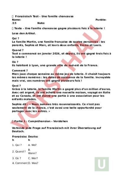 Arbeitsblatt: Französisch Test Französisch Test – Une famille chanceuse Französisch Test – Une famille chanceuse Französisch Test – Une famille chanceuse