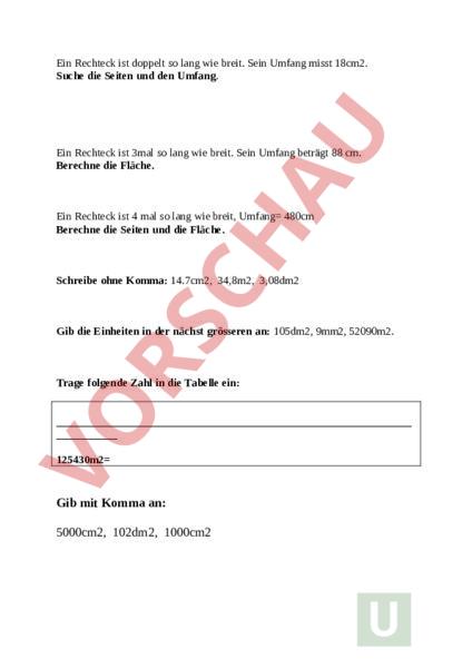 Ein Rechteck ist doppelt so lang wie breit. Sein Umfang misst 18cm2. Suche die Seiten und den Umfang. Ein Rechteck ist 3mal so lang wie breit. Sein Umfang beträgt 88 cm. Berechne die Fläche. Ein Rechteck ist 4 mal so lang wie breit, Umfang 480cm Berechne die Seiten und die Fläche. Schreibe ohne Komma: 14.7cm2, 34,8m2, 3,08dm2 Gib die Einheiten in der nächst grösseren an: 105dm2, 9mm2, 52090m2. Trage folgende Zahl in die Tabelle ein: 125430m2 Gib mit Komma an: 5000cm2, 102dm2, 1000cm2