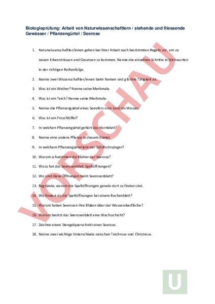 Biologieprüfung: Arbeit von Naturwissenschaftlern stehende und fliessende Gewässer Pflanzengürtel Seerose 1. Naturwissenschaftler/innen gehen bei ihrer Arbeit nach bestimmten Regeln vor, um zu neuen Erkenntnissen und Gesetzen zu kommen. Nenne die einzelnen Schritte in Stichworten in der richtigen Reihenfolge. 2. Nenne zwei Wissenschaftler/innen beim Namen und gib ihre Tätigkeit an. 3. Was ist ein Weiher? Nenne seine Merkmale. 4. Was ist ein Teich? Nenne seine Merkmale. 5. Nenne die Pflanzengürtel eines Seeufers vom Land ins Wasser. 6. Was ist ein Froschlöffel? 7. In welchen Pflanzengürtel gehört das Hornblatt? 8. Nenne eine andere Pflanze in diesem Gürtel. 9. In welchem Pflanzengürtel lebt der Schilfrohrsänger? 10. Warum schwimmen die Blätter der Seerose? 11. Wozu hat das Seerosenblatt Spaltöffnungen? 12. Wo sind diese Öffnungen beim Seerosenblatt? 13. Begründe, warum die Spaltöffnungen gerade dort zu finden sind. 14. Wo findest du die Spaltöffnungen bei einem Buchenblatt? 15. Warum haben Seerosen ihre Blüten über der Wasseroberfläche? 16. Warum besitzt das Seerosenblatt eine Wachsschicht? 17. Zeichne einen Stengelquerschnitt einer Seerose. 18. Nenne zwei wichtige Unterschiede zwischen Teichrose und Christrose.