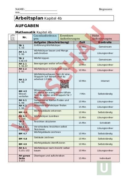 NAME:_ am:_ Begonnen Arbeitsplan Kapitel 4b AUFGABEN Mathematik Kapitel 4b Nr. TB 1 S. 48 AH 1.1 S. 96 TB 2 S.48-49 AH 2.1 S. 96-97 AH 2.2 S. 97 AH 2.3 S. 98 BM 4.5 Wissen vertiefen AH 4.1 S. 98 AH 4.2 S. 99 BM 4.6 AH 4.3 S. 100 TB 5 S. 50 AH 5.1 S.100-101 BM 4.7 BM 4.8 BM 4.9 Grundanforderun Erweitere gen Anforderungen Aufgabe (Beschreibung) Zeit Einführung Würfelkörper Würfelkörper bauen und Menge aufschreiben Würfel kippen Bewegungen weiter erforschen Würfelkörper in Gedanken kippen Würfelkörperbauen: Setz dir eine Stoppuhr auf deinem iPad du arbeitest 10 Min. Wissen vertiefen: DU darfst ein wenig herum tüfteln Stell dir wieder eine Stoppuhr für 7 Min Gemeinsame Kanten finden und markieren Passende Würfelkörper finden Würfelgebäude erkennen Würfelkörper zuordnen Ansichten skizzieren Verschiedene Ansichten selbst Skizzieren Würfelgebäude zeichnen Gebäude zeichnen Würfelgebäude identifizieren AH 6.1 S.101-102 Würfelkörper nach Ansicht selber bauen AH ganze Seite 103 Überlegen und aufschreiben Hohe Anforderungen Kontrolle 10 Min Gemeinsam 10 Min Lösungsordner 15 Min Gemeinsam 10 Min Lösungsordner 10 Min Lösungsordner 10 Min Internet 7 Min Selbstständig 10 Min Lösungsordner 15 Min Lösungsordner 10 Min Selbstständig 15 Min Lösungsordner 15 Min Extrablatt Lösungsordner 10 Min Selbstständig 10 Min Selbstständig 10 Min Selbstständig 10 Min Lösungsordner 15 Min Individuell NAME:_ am:_ Kommst du nicht weiter? Alternativen Begonnen