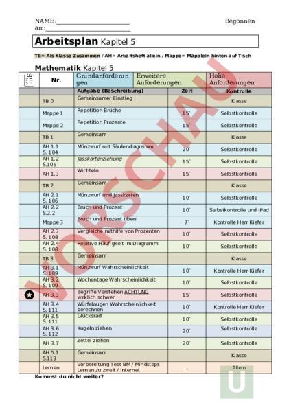 NAME:_ am:_ Begonnen Arbeitsplan Kapitel 5 TB Als Klasse Zusammen AH Arbeitsheft allein Mappe Mäpplein hinten auf Tisch Mathematik Kapitel 5 Nr. TB 0 Mappe 1 Mappe 2 TB 1 AH 1.1 S. 104 AH 1.2 S.105 AH 1.3 TB 2 AH 2.1 S. 106 AH 2.2 S.2.2 Mappe 3 AH 2.3 S. 108 AH 2.4 S. 108 TB 3 AH 3.1 S. 109 AH 3.2 S. 109 AH 3.3 AH 3.4 S. 111 AH 3.5 S. 111 AH 3.6 S. 112 AH 3.7 AH 5.1 S.113 Grundanforderun gen Erweitere Anforderungen Aufgabe (Beschreibung) Gemeinsamer Einstieg Repetition Brüche Repetition Prozente Zeit Münzwurf mit Säulendiagramm Jasskartenziehung Wichteln 15 Selbstkontrolle 15 Selbstkontrolle Klasse 20 Selbstkontrolle 15 Selbstkontrolle 15 Selbstkontrolle Gemeinsam Münzwurf und Jasskarten Bruch und Prozent Bruch und Prozent üben Vergleiche mithilfe von Prozenten Relative Häufigkeit im Diagramm Klasse 10 Selbstkontrolle 10 Selbstkontrolle und iPad 7 Kontrolle Herr Kiefer 10 Selbstkontrolle 10 Selbstkontrolle Gemeinsam Münzwurf Wahrscheinlichkeit Wochentage Wahrscheinlichkeit Begriffe Verstehen ACHTUNG wirklich schwer Würfelaugen Wahrscheinlichkeit berechnen Glücksrad Kugeln ziehen Zettel ziehen Kontrolle Klasse Gemeinsam Klasse 10 Kontrolle Herr Kiefer 10 Selbstkontrolle 15 Selbstkontrolle 10 Kontrolle Herr Kiefer 10 Selbstkontrolle 20 20 Gemeinsam Vorbereitung Test BM Mindsteps Lernen zu zweit Internet Kommst du nicht weiter? Lernen Hohe Anforderungen Selbstkontrolle Selbstkontrolle Klasse Allein NAME:_ am:_ Begonnen NAME:_ am:_ Begonnen Hier ist vlt eine Hilfe Alternativen wenn du mal eine Pause brauchst: Abbildung 1 MIndsteps Link Abbildung 4 Lehrer Schmidt Zufallsvers uch Abbildung 5 Schach online 7 Minuten Abbildung 3absolute Häufigkeit relative Häufigkeit Lehrer Schmidt Abbildung 2 Snake game online 5 Min