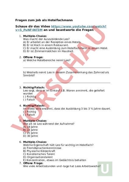 Fragen zum Job als Hotelfachmann Schaue dir das Video vS_PuNF4Kf3M an und beantworte die Fragen 1. Multiple-Choice: Was macht der Auszubildende Leo? A) Er arbeitet an der Rezeption eines Hotels. B) Er ist Koch in einem Restaurant. C) Er macht eine Ausbildung zum Hotelfachmann in einem Hotel. D) Er ist Zimmermädchen im Haushalt. 2. Offene Frage: a) Welche Hotelbereiche nennt Leo? b) Weshalb nennt Leo in diesem Zusammenhang das Zahnrad als Sinnbild? 3. Richtig/Falsch: Leo sagt, dass er im Einkauf z.B. Waren annimmt, die geliefert wurden ) Richtig ) Falsch 4. Richtig/Falsch: Im Video wird erwähnt, dass die Ausbildung 3 bis 3 Jahre dauert. ) Richtig ) Falsch 5. Multiple-Choice: Wie alt ist Leo während der Aufnahme? A) 18 Jahre B) 22 Jahre C) 25 Jahre D) 30 Jahre 6. Multiple-Choice: Welche Eigenschaft hält Leo für wichtig im Hotelfach? A) Fremdsprachenkenntnisse B) Physische Körperkraft C) Künstlerisches Talent D) Organisationstalent E) Konzentration, etwas im Gedächtnis behalten 7. Offene Frage: Wie viele Arbeitsstunden und -tage hat Leos Arbeitswoche? 8. Richtig/Falsch: Das Video zeigt, dass Leo am liebsten im Einkauf und an der Bar arbeitet ) Richtig ) Falsch 9. Multiple-Choice: Was gehört zum Outfit in Leos Hotel dazu? A) schwarze Lederschuhe B) Halstuch oder Fliege C) Jeanshemd D) Schwarze Hose 10. Offene Frage: In welche zwei Teile ist die Ausbildung unterteilt? 11. Multiple-Choice: Welche Unterrichtsinhalte werden von der Berufsschule genannt? A) Kaffeekunde B) Arbeiten im Service C) Weinkunde D) Lebensmittelhygiene 12. Offene Frage: Wie sieht Leo die Zukunft in diesem Beruf? Möchte er weiterarbeiten oder etwas anderes machen? 13. Richtig/Falsch: Leo mag es nicht, dass er im Hotel die Azubi-(Lernenden-)Trainings durchführen darf ) Richtig ) Falsch Fragen zum Job als Hotelfachmann Lösungen Schaue dir das Video vS_PuNF4Kf3M an und beantworte die Fragen 1. Multiple-Choice: Was macht der Auszubildende Leo? A) Er arbeitet an der Rezeption eines Hotels. B) Er ist Koch in einem Restaurant. C) Er macht eine Ausbildung zum Hotelfachmann in einem Hotel. D) Er ist Zimmermädchen im Haushalt. 2. Offene Frage: a) Welche Hotelbereiche nennt Leo? Restaurant, Bar, Lobby, Frontoffice b) Weshalb nennt Leo in diesem Zusammenhang das Zahnrad als Sinnbild? Weil alle Bereiche eines Hotels zusammenarbeiten sollen, so wie die Zähne eines Zahnrades ineinandergreifen 3. Richtig/Falsch: Leo sagt, dass er im Einkauf z.B. Waren annimmt, die geliefert wurden ) Richtig ) Falsch 4. Richtig/Falsch: Im Video wird erwähnt, dass die Ausbildung 3 bis 3 Jahre dauert. ) Richtig ) Falsch (korrekt wäre 2 bis 3 Jahre) 5. Multiple-Choice: Wie alt ist Leo während der Aufnahme? A) 18 Jahre B) 22 Jahre C) 25 Jahre D) 30 Jahre 6. Multiple-Choice: Welche Eigenschaft hält Leo für wichtig im Hotelfach? A) Fremdsprachenkenntnisse B) Physische Körperkraft C) Künstlerisches Talent D) Organisationstalent E) Konzentration, etwas im Gedächtnis behalten 7. Offene Frage: Wie viele Arbeitsstunden und -tage hat Leos Arbeitswoche? 40 Stunden an 5 Tagen (auch am Wochenende 8. Richtig/Falsch: Das Video zeigt, dass Leo am liebsten im Einkauf und an der Bar arbeitet ) Richtig ) Falsch 9. Multiple-Choice: Was gehört zum Outfit in Leos Hotel dazu? A) schwarze Lederschuhe B) Halstuch oder Fliege C) Jeanshemd D) Schwarze Hose 10. Offene Frage: In welche zwei Teile ist die Ausbildung unterteilt? in die schulische Ausbildung und betriebliche Ausbildung 11. Multiple-Choice: Welche Unterrichtsinhalte werden von der Berufsschule genannt? A) Kaffeekunde B) Arbeiten im Service C) Weinkunde D) Lebensmittelhygiene 12. Offene Frage: Wie sieht Leo die Zukunft in diesem Beruf? Möchte er weiterarbeiten oder etwas anderes machen? Leo möchte dort bleiben 13. Richtig/Falsch: Leo mag es nicht, dass er im Hotel die Azubi-(Lernenden-)Trainings durchführen darf ) Richtig ) Falsch