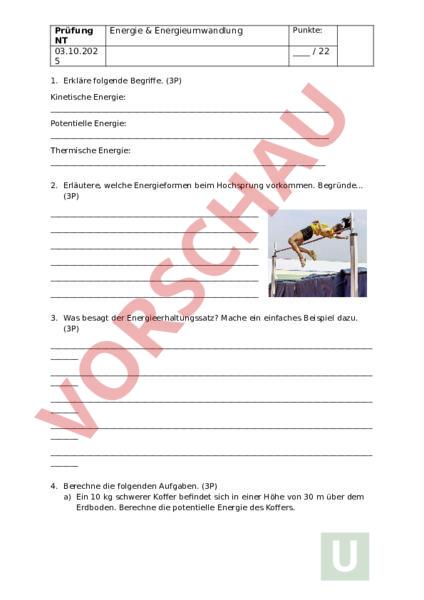 Prüfung NT 03.10.202 5 Energie Energieumwandlung Punkte: 22 1. Erkläre folgende Begriffe. (3P) Kinetische Energie: Potentielle Energie: Thermische Energie: 2. Erläutere, welche Energieformen beim Hochsprung vorkommen. Begründe. (3P) 3. Was besagt der Energieerhaltungssatz? Mache ein einfaches Beispiel dazu. (3P) 4. Berechne die folgenden Aufgaben. (3P) a) Ein 10 kg schwerer Koffer befindet sich in einer Höhe von 30 über dem Erdboden. Berechne die potentielle Energie des Koffers. b) Ein Ball mit einer Masse von 0,5 kg wird mit einer Geschwindigkeit von 5 km/h geworfen. c) Berechne die Arbeit, die ein Kran verrichtet, um eine Palette mit Steinen anzuheben. (Masse der Palette: 500kg, Höhe: 10m) 5. Erkläre den Unterschied zwischen erneuerbaren und nicht erneuerbaren Energie-formen. (2P) 6. Nenne je 2 erneuerbare und 2 nicht erneuerbare Energieformen. (2P) Erneuerbar Nicht erneuerbar 7. Erkläre in eigenen Worten, was bei einem Lagerfeuer mit der Energie passiert. (3P) 8. Nenne 3 Beispiele aus deinem Alltag, bei denen Energie umgewandelt wird. (3P) 9. Ordne zu (2P) Chemische Energie Ein Apfel am Baum Potentielle Energie Eine Batterie Kinetsiche Energie Ein rollender Ball Elektrische Energie Strom aus der Steckdose