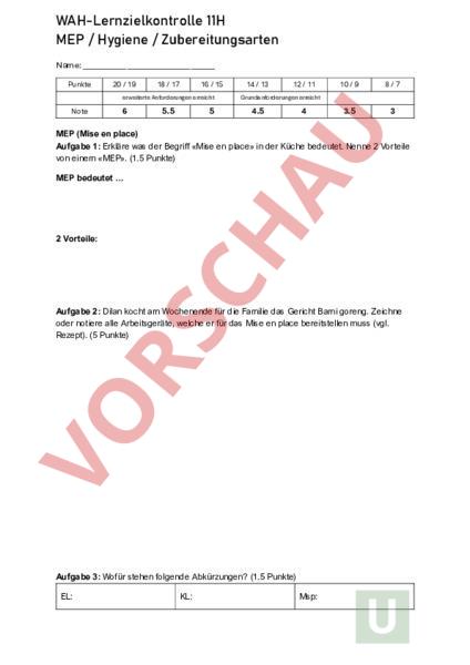 WAH-Lernzielkontrolle 11H MEP Hygiene Zubereitungsarten Name: Punkte 20 19 18 17 16 15 erweiterte Anforderungen erreicht Note 6 5.5 5 14 13 12 11 10 9 8/7 3.5 3 Grundanforderungen erreicht 4.5 4 MEP (Mise en place) Aufgabe 1: Erkläre was der Begriff «Mise en place» in der Küche bedeutet. Nenne 2 Vorteile von einem «MEP». (1.5 Punkte) MEP bedeutet 2 Vorteile: Aufgabe 2: Dilan kocht am Wochenende für die Familie das Gericht Bami goreng. Zeichne oder notiere alle Arbeitsgeräte, welche er für das Mise en place bereitstellen muss (vgl. Rezept). (5 Punkte) Aufgabe 3: Wofür stehen folgende Abkürzungen? (1.5 Punkte) EL: KL: Msp: Hygiene in der Küche Aufgabe 2: Dilan bereitet das Gericht mit Pouletgeschnetzeltem zu. Notiere 5 verschiedene, relevante Hygieneregeln, die er beachten sollte. (5 Punkte) 1. 2. 3. 4. 5. Kühlschrank korrekt einräumen Aufgabe 3: (1.5 Punkte) Dilan hat Pouletgeschnetzeltes beim Metzger eingekauft. An welche Stelle sollte er das Fleisch im Kühlschrank lagern? Markiere die Stelle. Erkläre weshalb: Zubereitungsarten Richtig oder falsch? Kreuze an und korrigiere falsche Aussagen. (3 Punkte) Dilan stellt die Bratpfanne auf den Herd und schaltet diesen erst ein, wenn das Pouletgeschnetzelte in der Pfanne liegt. richtig falsch Dilan verwendet zum Braten des Poulets ein kaltgepresstes Olivenöl extra vergine. richtig falsch Dilan wendet das Pouletgeschnetzelte erst, wenn es nicht mehr am Pfannenboden klebt und sich eine Kruste gebildet hat. richtig falsch Die chinesischen Nudeln gibt Dilan erst in Wasser, wenn dieses kocht. richtig falsch Dilan gibt 1 Prise Salz in das Kochwasser für die chinesischen Nudeln. richtig falsch Dilan lässt die Nudeln am Ende der Kochzeit noch weitere 5 Minuten im Wasser ziehen. richtig falsch Abwasch Nach dem Essen erledigt Dilan den Abwasch. (2.5 Punkte) a. Skizziere eine Abwaschsituation mit zwei Spülbecken von oben (Vogelperspektive). Beschrifte deine Skizze (z.B. Wassertemperatur, Spülmittelmenge, ). b. Notiere 2 Tipps, die Dilan beim Abwaschen von Hand beachtet.
