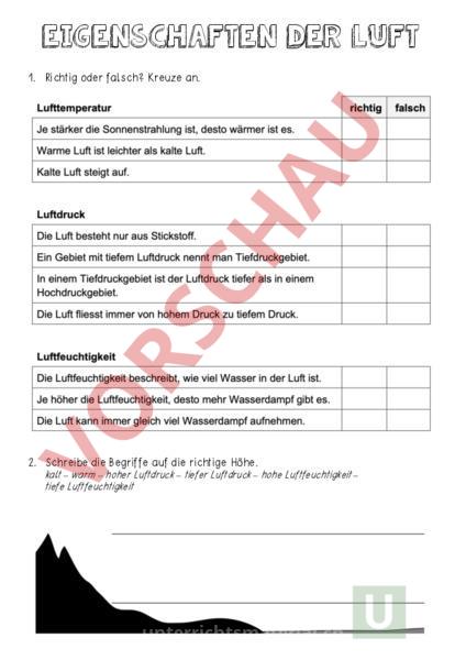 Eigenschaften der Luft 1. Richtig oder falsch? Kreuze an. 2. Schreibe die Begriffe auf die richtige Höhe. kalt – warm – hoher Luftdruck – tiefer Luftdruck – hohe Luftfeuchtigkeit – tiefe Luftfeuchtigkeit