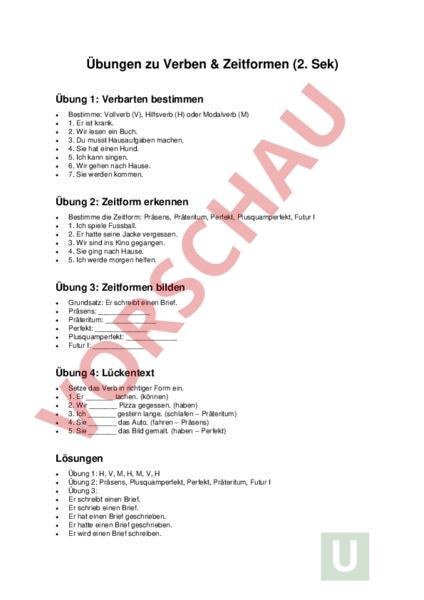 Übungen zu Verben Zeitformen (2. Sek) Übung 1: Verbarten bestimmen • • • • • • • • Bestimme: Vollverb (V), Hilfsverb (H) oder Modalverb (M) 1. Er ist krank. 2. Wir lesen ein Buch. 3. Du musst Hausaufgaben machen. 4. Sie hat einen Hund. 5. Ich kann singen. 6. Wir gehen nach Hause. 7. Sie werden kommen. Übung 2: Zeitform erkennen • • • • • • Bestimme die Zeitform: Präsens, Präteritum, Perfekt, Plusquamperfekt, Futur 1. Ich spiele Fussball. 2. Er hatte seine Jacke vergessen. 3. Wir sind ins Kino gegangen. 4. Sie ging nach Hause. 5. Ich werde morgen helfen. Übung 3: Zeitformen bilden • • • • • • Grundsatz: Er schreibt einen Brief. Präsens: Präteritum: Perfekt: Plusquamperfekt: Futur I: Übung 4: Lückentext • • • • • • Setze das Verb in richtiger Form ein. 1. Er lachen. (können) 2. Wir Pizza gegessen. (haben) 3. Ich gestern lange. (schlafen – Präteritum) 4. Sie das Auto. (fahren – Präsens) 5. Sie das Bild gemalt. (haben – Perfekt) Lösungen • • • • • • • • Übung 1: H, V, M, H, M, V, Übung 2: Präsens, Plusquamperfekt, Perfekt, Präteritum, Futur Übung 3: Er schreibt einen Brief. Er schrieb einen Brief. Er hat einen Brief geschrieben. Er hatte einen Brief geschrieben. Er wird einen Brief schreiben. • Übung 4: kann, haben, schlief, fährt, hat gemalt