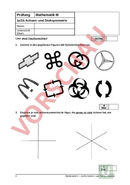 Prüfung Mathematik 1a/1b Achsen- und Drehsymmetrie Name: Unterschrift Eltern: Löse ohne Taschenrechner! 1. 36 Pkt. Zeichne in den gegebenen Figuren alle Symmetrieachsen ein. 6 Pkt. 2. Skizziere je eine achsensymmetrische Figur, die genau so viele Achsen hat, wie gegeben sind. 2 Pkt. 1 Mathematik 1 – 1a/1b Achsen- und Drehsymmetrie 3. Vervollständige folgende Figuren auf dem Geobrett, sodass die rot eingezeichneten Symmetrieachsen stimmen. 6 Pkt. 4. Ergänze die Figuren so, dass sie achsensymmetrisch werden. Zeichne danach die Symmetrieachse ein. 4.5 Pkt. 2 Mathematik 1 – 1a/1b Achsen- und Drehsymmetrie 5. Markiere in diesen drehsymmetrischen Figuren den Drehpunkt, zeichne den kleinsten Drehwinkel ein und notiere seine Grösse. 7.5 Pkt. 6. Skizziere je eine drehsymmetrische Figur, die nicht achsensymmetrisch ist. 4 Pkt. 3 Mathematik 1 – 1a/1b Achsen- und Drehsymmetrie 7. Auf dem Geobrett ist eine Figur mit Hilfe eines Gummibands aufgespannt. Verändere die Figur so, dass die neue Figur drehsymmetrisch ist. 3 Pkt. 8. Ergänze folgende Figuren so, dass sie drehsymmetrisch werden. 3 Pkt. 4 Mathematik 1 – 1a/1b Achsen- und Drehsymmetrie