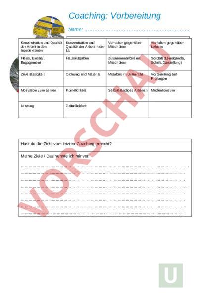Coaching: Vorbereitung Name: . Was beschäftigt dich Verhalten gerade besonders? Datum: Konzentration und Qualität Konzentration und gegenüber Verhalten gegenüber der Arbeit in den Qualität der Arbeit in der Mitschülern Lehrern Inputlektionen LU Fleiss, Einsatz, Engagement Hausaufgaben Zusammenarbeit mit Mitschülern Sorgfalt (Lernagenda, Schrift, Darstellung) Zuverlässigkeit Ordnung und Material Mitarbeit im Unterricht Vorbereitung auf Prüfungen Motivation zum Lernen Was hast du seit dem letztenSelbstständiges Coachinggespräch besonders gut gemacht? Wähle Pünktlichkeit Arbeiten Medienkonsum Leistung Gründlichkeit 2-4 Felder und male sie grün aus! Bring eine besonders gut gelungene Arbeit mit! Highlights? Womit bist du weniger zufrieden? Wähle 2-4 Felder und male sie rot aus! Hast du die Ziele vom letzten Coaching erreicht? Meine Ziele Das nehme ich mir vor: . . . . . . .