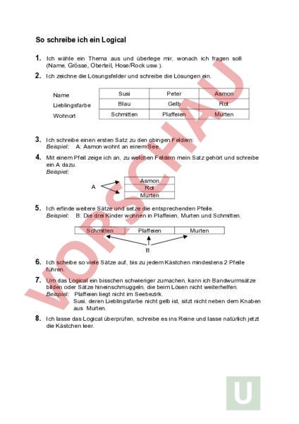 So schreibe ich ein Logical 1. Ich wähle ein Thema aus und überlege mir, wonach ich fragen soll (Name, Grösse, Oberteil, Hose/Rock usw.). 2. Ich zeichne die Lösungsfelder und schreibe die Lösungen ein. Name Susi Peter Asmon Lieblingsfarbe Blau Gelb Rot Schmitten Plaffeien Murten Wohnort 3. Ich schreibe einen ersten Satz zu den obingen Feldern: Beispiel: A: Asmon wohnt an einem See. 4. Mit einem Pfeil zeige ich an, zu welchen Feldern mein Satz gehört und schreibe ein dazu. Beispiel: Asmon Rot Murten 5. Ich erfinde weitere Sätze und setze die entsprechenden Pfeile. Beispiel: B: Die drei Kinder wohnen in Plaffeien, Murten und Schmitten. Schmitten Plaffeien Murten 6. Ich scheibe so viele Sätze auf, bis zu jedem Kästchen mindestens 2 Pfeile führen. 7. Um das Logical ein bisschen schwieriger zumachen, kann ich Bandwurmsätze bilden oder Sätze hineinschmuggeln, die beim Lösen nicht weiterhelfen. Beispiel: Plaffeien liegt nicht im Seebezirk. Susi, deren Lieblingsfarbe nicht gelb ist, sitzt nicht neben dem Knaben aus Murten. 8. Ich lasse das Logical überprüfen, schreibe es ins Reine und lasse natürlich jetzt die Kästchen leer.