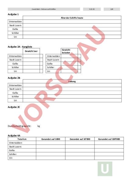 Zusatzblatt – Grössen auf Schiffen S.22-23 LU9 Aufgabe 1 Alter der Schiffe heute Unterwalden Stadt Luzern Gallia Schiller Uri Aufgabe 2A Rangliste Gewicht beladen Gewicht leer Unterwalden Unterwalden Stadt Luzern Stadt Luzern Gallia Gallia Schiller Schiller Uri Uri Aufgabe 2B Ladung Unterwalden Stadt Luzern Gallia Schiller Uri Aufgabe 2C Durchschni?sgewicht: kg Aufgabe 4A Total km Unterwalden: Stadt Luzern: Gallia: Schiller: Uri: Gerundet auf 1000 Gerundet auf 10000 Gerundet auf 100000