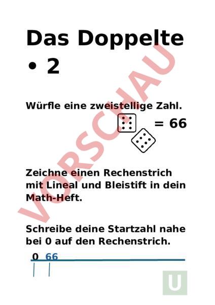 Das Doppelte •2 Würfle eine zweistellige Zahl. 66 Zeichne einen Rechenstrich mit Lineal und Bleistift in dein Math-Heft. Schreibe deine Startzahl nahe bei 0 auf den Rechenstrich. 0 66 Verdopple die Zahl und trage das Ergebnis auf deinem Rechenstrich ein. 1 66 132 Verdopple die Zahl und trage das Ergebnis auf deinem Rechenstrich ein. Verdopple die Zahl und trage das Ergebnis auf deinem Rechenstrich ein. Verdopple die Zahl und trage das Ergebnis auf deinem Rechenstrich ein. Die Hälfte 2 Würfle eine zweistellige Zahl. 66 Zeichne einen Rechenstrich mit Lineal und Bleistift in dein Math-Heft. Schreibe deine Startzahl an das Ende auf deinem Rechenstrich. 0 66 Halbiere die Zahl und trage das Ergebnis auf deinem Rechenstrich ein. 0 33 66 Halbiere die Zahl nochmals und trage das Ergebnis auf deinem Rechenstrich ein. Halbiere die Zahl nochmals und trage das Ergebnis auf deinem Rechenstrich ein. Halbiere die Zahl nochmals und trage das Ergebnis auf deinem Rechenstrich ein.