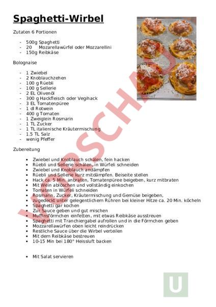 Spaghetti-Wirbel Zutaten 6 Portionen 500g Spaghetti 20 Mozarellawürfel oder Mozzarellini 150g Reibkäse Bolognaise 1 Zwiebel 2 Knoblauchzehen 100 Rüebli 100 Sellerie 2 EL Olivenöl 300 Hackfleisch oder Vegihack 3 EL Tomatenpüree 1 dl Rotwein 400 Tomaten 1 Zweiglein Rosmarin 1 TL Zucker 1 TL italienische Kräutermischung 1.5 TL Salz wenig Pfeffer Zubereitung Zwiebel und Knoblauch schälen, fein hacken Rüebli und Sellerie schälen, in Würfeli schneiden Zwiebel und Knoblauch andämpfen Rüebli und Sellerie kurz mitdämpfen. Beiseite stellen Hack ca. 5 Min. anbraten, Tomatenpüree beigeben, kurz mitbraten Mit Wein ablöschen und vollständig einkochen Tomaten in Würfeli schneiden Rosmarin, Zucker, Kräutermischung und Gemüse beigeben, zugedeckt unter gelegentlichem Rühren bei kleiner Hitze ca. 20 Min. köcheln Spaghetti gar kochen Zur Sauce geben und gut mischen Muffinsförmchen einfetten, mit etwas Reibkäse ausstreuen Spaghetti mit Tranchiergabel aufrollen und in die Förmchen geben Mozzarellawürfen oben leicht reindrücken Restliche Sauce über die Wirbel verteilen Mit dem Reibkäse bestreuen 10-15 Min bei 180 Heissluft backen Mit Salat servieren