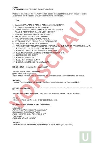 Fabula EVENUS UND PHILETUS, DIE SKLAVENKINDER Valens ist bei Julia auf Besuch. Während die beiden den Vogel Ferox suchen, ereignet sich ein Zwischenfall mit den beiden Sklavenkindern Evenus und Philetus. Text: 1 2 3 4 5 6 7 8 9 10 11 12 13 14 15 16 17 IULIA VOCAT: „FEROX! FEROX! FEROX AVIS IULIAE EST. IULIA VALENTEM AMICUM INTERROGAT: „SALVE VALENS! QUAERO FERO CEM. UBI EST FEROX? VALENS RESPONDET: „SALVE IULIA, NESCIO. AMICA ET AMICUS PERISTYLIUM INTRANT. VOCES SANUCII ET PATERN AUDIUNT. TUM SANUCIUM ET PATERNUM VIDENT. ET PRIMUS VENIT. PRIMUS FILIUS PATERN EST. SUBITO VOCES LIBERORUM AUDIUNT. TUM EVENUS ET PHILETUS LIBERI IN PERISTYLIUM CURRUNT ET PRIMUM IMPELLUNT. EVENUS ET PHILETUS SERVI SANUCII SUNT. PRIMUS CLAMAT: „IULIA, SERVOS PUNIRE DEBES. IULIA RESPONDET: „EVENUS ET PHILETUS LIBERI SUNT. LIBERI FERO CES SUNT. PRIMUS: „SERVI SUNT. IULIA: „ET HOMINES SUNT. PRIMUS: „VALETE, HIC NON REMANEO.