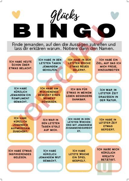 Glücks BINGO Finde jemanden, auf den die Aussagen zutreffen und lass dir erklären warum. Notiere dann den Namen. Ich habe heute Schon über etwas gelacht. Ich habe in den letzten Tagen jemandem geholfen. Ich habe in der letzten Woche etwas Neues gelernt. Ich habe ein Ziel, auf das ich mich freue, hinzuarbeiten Ich habe kürzlich jemandem ein Kompliment gemacht. Ich habe am Wochenende bewusst einen Moment genossen. Ich bin für etwas in meinem Leben besonders dankbar. Ich war in letzter Zeit draussen in der Natur. Ich habe kürzlich jemandem aufmerksam zugehört. Ich war in den letzten Tagen stolz auf mich. Ich habe in den letzten Wochen eng mit jemandem zusammengearbeit et. Ich habe in letzter Zeit etwas gefeiert. Ich habe etwas Inspirierendes gelesen. Ich habe kürzlich jemandem Mut gemacht. Ich habe letzte Woche ein Spiel gespielt. Ich habe mich kürzlich kreativ betätigt.