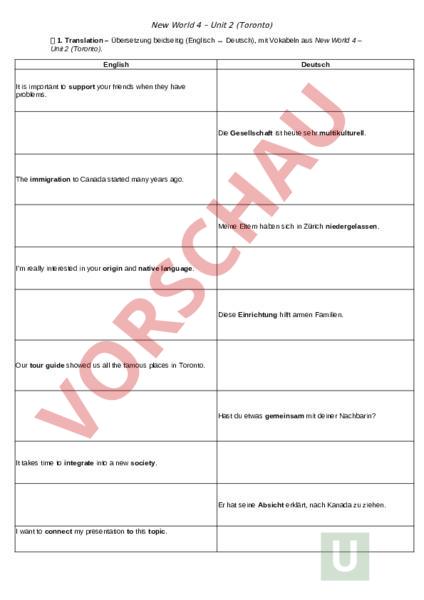 Übersetzung beidseitig (Englisch ↔ Deutsch), mit Vokabeln aus New World 4 – Unit 2 (Toronto).