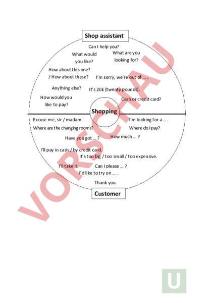 Shop assistant Can help you? What are you What would looking for? you like? How about this one? How about these? Anything else? Im sorry, were out of Its 20£ (twenty pounds). How would you like to pay? Cash or credit card? Shopping Excuse me, sir madam. Im looking for Where are the changing rooms? Where do pay? Have you got How much Ill pay in cash by credit card. Its too big too small too expensive. Ill take it. Can please Id like to try on Thank you. Customer