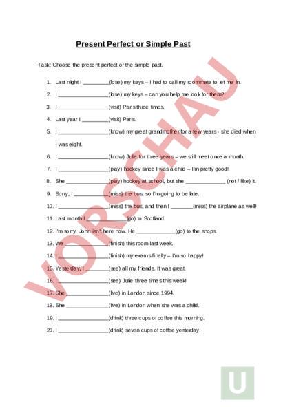 Present Perfect or Simple Past Task: Choose the present perfect or the simple past. 1. Last night (lose) my keys – had to call my roommate to let me in. 2. (lose) my keys – can you help me look for them? 3. (visit) Paris three times. 4. Last year (visit) Paris. 5. (know) my great grandmother for few years she died when was eight. 6. (know) Julie for three years – we still meet once month. 7. (play) hockey since was child – Im pretty good! 8. She (play) hockey at school, but she 9. Sorry, (miss) the bus, so Im going to be late. 10. (miss) the bus, and then 11. Last month (not like) it. (miss) the airplane as well! (go) to Scotland. 12. Im sorry, John isnt here now. He (go) to the shops. 13. We (finish) this room last week. 14. (finish) my exams finally – Im so happy! 15. Yesterday, (see) all my friends. It was great. 16. (see) Julie three times this week! 17. She (live) in London since 1994. 18. She (live) in London when she was child. 19. (drink) three cups of coffee this morning. 20. (drink) seven cups of coffee yesterday. Answers 1. Last night lost my keys – had to call my flatmate to let me in. 2. Ive lost my keys – can you help me look for them? 3. Ive visited Paris three times. 4. Last year visited Paris. 5. knew my great grandmother for few years – she died when was eight. 6. Ive known Julie for three years – we still meet once month. 7. Ive played hockey since was child – Im pretty good! 8. She played hockey at school, but she didnt like it. 9. Sorry, Ive missed the bus, so Im going to be late. 10. missed the bus, and then missed the aeroplane as well! 11. Last month went to Scotland. 12. Im sorry, John isnt here now. He gone to the shops. 13. We finished this room last week. 14. Ive finished my exams finally – Im so happy! 15. Yesterday, saw all my friends. It was great! 16. Ive seen Julie three times this week! 17. She lived in London since 1994. 18. She lived in London when she was child. 19. Ive drunk three cups of coffee this morning. 20. drank seven cups of coffee yesterday.