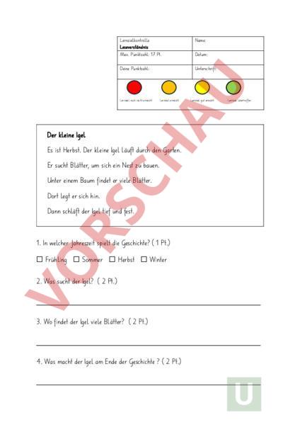 Lernzielkontrolle Leseverständnis Max. Punktzahl: 17 Pt. Name: Deine Punktzahl: Unterschrift: Lernziel noch nicht erreicht Lernziel erreicht Datum: Lernziel gut erreicht Lernziel übertroffen Der kleine Igel Es ist Herbst. Der kleine Igel läuft durch den Garten. Er sucht Blätter, um sich ein Nest zu bauen. Unter einem Baum findet er viele Blätter. Dort legt er sich hin. Dann schläft der Igel tief und fest. 1. In welcher Jahreszeit spielt die Geschichte? 1 Pt.) Frühling Sommer Herbst Winter 2. Was sucht der Igel? 2 Pt.) 3. Wo findet der Igel viele Blätter? 2 Pt.) 4. Was macht der Igel am Ende der Geschichte ( 2 Pt.) Lies genau und zeichne. Der Igel liegt unter einem Baum. 2 Pt.) Neben ihm liegt ein rotes Blatt und ein gelbes Blatt. 3 Pt.) Über dem Baum fliegt ein Vogel. 3 Pt.) Rechts vom Igel steht eine Katze. 2 Pt.) Gesamtbewertung Teil Punkte erreicht Punkte möglich Teil 1: Lesen und Verstehen 7 Teil 2: Lesen und Zeichnen 10