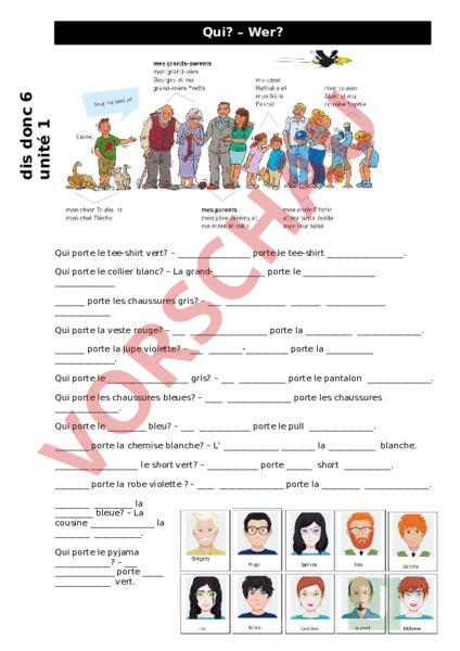dis donc 6 unité 1 Qui? – Wer? Qui porte le tee-shirt vert? – porte le tee-shirt . Qui porte le collier blanc? – La grand- porte le porte les chaussures gris? – Qui porte la veste rouge? – porte la . porte la jupe violette? – - porte la . Qui porte le gris? – porte le pantalon. Qui porte les chaussures bleues? – porte les chaussures. Qui porte le bleu? – porte le pull. porte la chemise blanche? – la blanche. le short vert? – porte short. porte la robe violette - porte la . la bleue? – La cousine la . Qui porte le pyjama? – porte vert. Frage deinen Nachbarn wer das ist. Exemple: Cest qui? – C‘est Joël. Cest qui? – Cest Julie. Julie un visage triangulaire et un petit nez. Ses yeux sont verts et ses cheveux sont bruns. Elle de fines lèvres. Lumi la peau foncée. Ses yeux sont clairs et ses cheveux sont noirs. Claire un nez pointu et porte des lunettes. Ses cheveux sont courts. Elle porte des boucles doreilles. George porte des lunettes et une barbe et une moustache. Ses cheveux sont bruns. Jean les cheveux roux foncés et les yeux bleus. Il un large nez. Il porte une barbe et une moustache. Caroline un visage rond et jovial. Elle de petits yeux noirs. Ses cheveux sont roux et elle des couettes. Lucie de longs cheveux blonds et lisses. Elle de grands yeux noisette. Ses lèvres sont pulpeuses. Hervé les yeux bleus et un nez crochu. Il est pratiquement chauve.