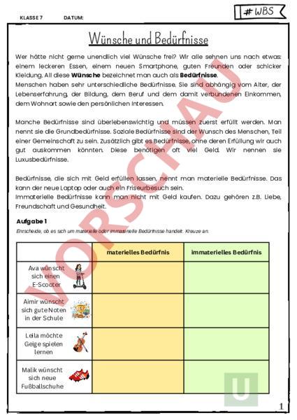KLASSE 7 WBS DATUM: Wünsche und Bedürfnisse Wer hätte nicht gerne unendlich viel Wünsche frei? Wir alle sehnen uns nach etwas: einem leckeren Essen, einem neuen Smartphone, guten Freunden oder schicker Kleidung. All diese Wünsche bezeichnet man auch als Bedürfnisse. Menschen haben sehr unterschiedliche Bedürfnisse. Sie sind abhängig vom Alter, der Lebenserfahrung, der Bildung, dem Beruf und dem damit verbundenen Einkommen, dem Wohnort sowie den persönlichen Interessen. Manche Bedürfnisse sind überlebenswichtig und müssen zuerst erfüllt werden. Man nennt sie die Grundbedürfnisse. Soziale Bedürfnisse sind der Wunsch des Menschen, Teil einer Gemeinschaft zu sein. Zusätzlich gibt es Bedürfnisse, ohne deren Erfüllung wir auch gut auskommen könnten. Diese benötigen oft viel Geld. Wir nennen sie Luxusbedürfnisse. Bedürfnisse, die sich mit Geld erfüllen lassen, nennt man materielle Bedürfnisse. Das kann der neue Laptop oder auch ein Friseurbesuch sein. Immaterielle Bedürfnisse kann man nicht mit Geld kaufen. Dazu gehören z.B. Liebe, Freundschaft und Gesundheit. Aufgabe 1 Entscheide, ob es sich um materielle oder immaterielle Bedürfnisse handelt. Kreuze an. materielles Bedürfnis Ava wünscht sich einen E-Scooter Aimir wünscht sich gute Noten in der Schule Leila möchte Geige spielen lernen Malik wünscht sich neue Fußballschuhe immaterielles Bedürfnis KLASSE 7 WBS DATUM: Aufgabe 2 Zu welcher Gruppe der Bedürfnisse passen folgende Begriffe? Markiere in der passenden Farbe. Wasser Freunde treffen Luxus Bedürfnisse Smartphone Kleidung Anerkennung Soziale Bedürfnisse Ferienreise Essen Haustier Grundbedürfnisse Aufgabe 3 Wähle drei Bedürfnisse aus der Liste von Aufgabe 2 und erkläre, warum du sie dieser Stufe zugeordnet hast. Beispiel: Wasser Grundbedürfnis, weil der Mensch es zum Überleben braucht. 1. 2. 3. Aufgabe 4 Überlege, warum nicht alle Bedürfnisse gleichzeitig erfüllt werden können. Tipp: Welche Bedürfnisse würdest du zuerst erfüllen? Welche könntest du warten lassen? Gibt es Bedürfnisse, die für dich wichtiger sind als andere? KLASSE 7 DATUM: WBS Raketenaufgabe Hat die Person auf dem Bild die richtige Wahl getroffen? Welche Dinge hätte sie deiner Meinung nach wählen sollen und in welcher Reihenfolge? Begründe deine Entscheidung 1. 2. 3. Begründung: