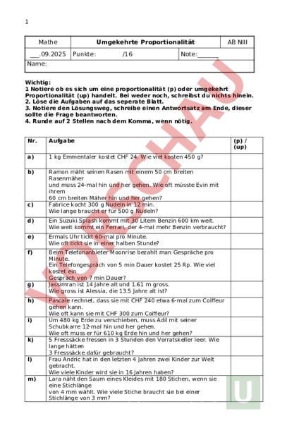 1 Mathe.09.2025 Umgekehrte Proportionalität Punkte: /16 AB NIII Note:_ Name: Wichtig: 1 Notiere ob es sich um eine proportionalität (p) oder umgekehrt Proportionalität (up) handelt. Bei weder noch, schreibst du nichts hinein. 2. Löse die Aufgaben auf das seperate Blatt. 3. Notiere den Lösungsweg, schreibe einen Antwortsatz am Ende, dieser sollte die Frage beantworten. 4. Runde auf 2 Stellen nach dem Komma, wenn nötig. Nr. Aufgabe a) 1 kg Emmentaler kostet CHF 24. Wie viel kosten 450 g? b) Ramon mäht seinen Rasen mit einem 50 cm breiten Rasenmäher und muss 24-mal hin und her gehen. Wie oft müsste Evin mit ihrem 60 cm breiten Mäher hin und her gehen? Fabrice kocht 300 Nudeln in 12 min. Wie lange braucht er für 500 Nudeln? c) d) Ein Suzuki Splash kommt mit 30 Litern Benzin 600 km weit. Wie weit kommt ein Ferrari, der 4-mal mehr Benzin verbraucht? e) Ermals Uhr tickt 60-mal pro Minute. Wie oft tickt sie in einer halben Stunde? f) Beim Telefonanbieter Moonrise bezahlt man Gespräche pro Minute. Ein Telefongespräch von 5 min Dauer kostet 25 Rp. Wie viel kostet ein Gespräch von 7 min Dauer? Jassimran ist 14 Jahre alt und 1.61 gross. Wie gross ist Alessia, die 13.5 Jahre alt ist? g) h) i) k) l) m) Pascale rechnet, dass sie mit CHF 240 etwa 6-mal zum Coiffeur gehen kann. Wie oft kann sie mit CHF 300 zum Coiffeur? Um 480 kg Erde zu verschieben, muss Adil mit seiner Schubkarre 12-mal hin und her gehen. Wie oft muss er für 610 kg Erde hin und her gehen? 5 Fresssäcke fressen in 3 Stunden den Vorratskeller leer. Wie lange hätten 3 Fresssäcke dafür gebraucht? Frau Andric hat in den letzten 4 Jahren zwei Kinder zur Welt gebracht. Wie viele Kinder wird sie in 16 Jahren haben? Lara näht den Saum eines Kleides mit 180 Stichen, wenn sie eine Stichlänge von 4 mm wählt. Wie viele Stiche braucht sie bei einer Stichlänge von 3 mm? (p) (up) 2