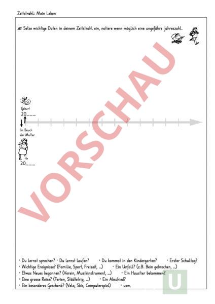 Zeitstrahl: Mein Leben Setze wichtige Daten in deinem Zeitstrahl ein, notiere wenn möglich eine ungefähre Jahreszahl. Geburt 20_ Im Bauch der Mutter 20_ Du lernst sprechen? Du lernst laufen? Du kommst in den Kindergarten? Erster Schultag? Wichtige Ereignisse? (Familie, Sport, Freizeit, ) Ein Unfall? (z.B. Bein gebrochen, ) Etwas Neues begonnen? (Verein, Musikinstrument, ) Ein Haustier bekommen? Eine grosse Reise? (Ferien, Städtetrip, ) Ein Abschied? Ein besonderes Geschenk? (Velo, Skis, Computerspiel) usw.