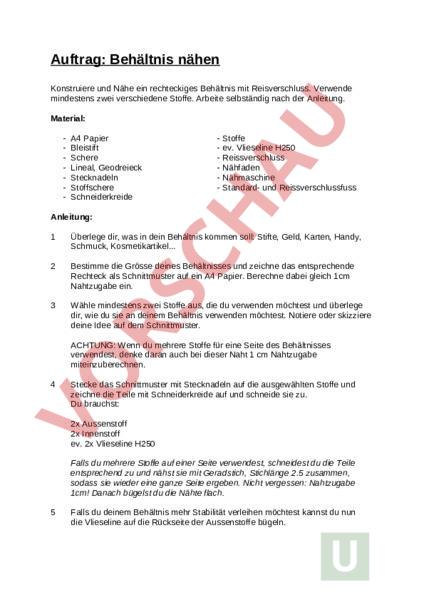 Auftrag: Behältnis nähen Konstruiere und Nähe ein rechteckiges Behältnis mit Reisverschluss. Verwende mindestens zwei verschiedene Stoffe. Arbeite selbständig nach der Anleitung. Material: A4 Papier Bleistift Schere Lineal, Geodreieck Stecknadeln Stoffschere Schneiderkreide Stoffe ev. Vlieseline H250 Reissverschluss Nähfaden Nähmaschine Standard- und Reissverschlussfuss Anleitung: 1 Überlege dir, was in dein Behältnis kommen soll: Stifte, Geld, Karten, Handy, Schmuck, Kosmetikartikel. 2 Bestimme die Grösse deines Behältnisses und zeichne das entsprechende Rechteck als Schnittmuster auf ein A4 Papier. Berechne dabei gleich 1cm Nahtzugabe ein. 3 Wähle mindestens zwei Stoffe aus, die du verwenden möchtest und überlege dir, wie du sie an deinem Behältnis verwenden möchtest. Notiere oder skizziere deine Idee auf dem Schnittmuster. ACHTUNG: Wenn du mehrere Stoffe für eine Seite des Behältnisses verwendest, denke daran auch bei dieser Naht 1 cm Nahtzugabe miteinzuberechnen. 4 Stecke das Schnittmuster mit Stecknadeln auf die ausgewählten Stoffe und zeichne die Teile mit Schneiderkreide auf und schneide sie zu. Du brauchst: 2x Aussenstoff 2x Innenstoff ev. 2x Vlieseline H250 Falls du mehrere Stoffe auf einer Seite verwendest, schneidest du die Teile entsprechend zu und nähst sie mit Geradstich, Stichlänge 2.5 zusammen, sodass sie wieder eine ganze Seite ergeben. Nicht vergessen: Nahtzugabe 1cm! Danach bügelst du die Nähte flach. 5 Falls du deinem Behältnis mehr Stabilität verleihen möchtest kannst du nun die Vlieseline auf die Rückseite der Aussenstoffe bügeln. 6 Wähle einen passenden Reissverschluss und schneide ihn zu. Der Reissverschluss muss 4 cm Länger sein als die Stoffkante an die er angebracht wird. Setzte den Gleiter ein. 7 Lege den Aussenstoff mit der rechten Seite nach oben auf deine Arbeitsfläche. Lege den Reissverschluss mit den Zähnen nach unten auf die Kante. Nun kommt der Innenstoff mit der linken Seite nach oben ebenfalls auf die Kante. Stecke die drei Lagen Aussenstoff-Reisverschluss-Innenstoff mit Stecknadeln fest. 8 Nun werden die Schichten der Kante entlang zusammengenäht. -Reissverschlussfüsschen -Nadelposition zu den Zähnchen hin -Geradstich -Stichlänge 2.5 9 Wiederhole Punkt 8 für die andere Seite. 10 Klappe die Kanten nach aussen und steppe sie entlang dem Reissverschluss links und rechts schmalkantig ab. -Standardfuss -Nadelposition Mitte -Geradstich -Stichlänge 2.5 11 Öffne nun den Reissverschluss ein Stück. Lege die Aussenstoffe und die Innenstoffe jeweils mit der rechten Seite aufeinander und stecke sie mit Stecknadeln fest. Nähe die beiden Teile zusammen. Bei den Innenstoffen musst du ca. 10cm offen lassen, um die Arbeit danach wenden zu können. Markiere die Öffnung mit Stecknadeln -Standardfuss -Nadelposition links -Stichlänge 2.5 VORSICHT: Beim Nähen über den Reissverschluss das Handrad betätigen, um zu merken, wenn die Nadel auf die Zähnchen stösst und nicht bricht. 12 Wende die Arbeit durch die Öffnung auf die schöne Seite und schliesse die Wendeöffnung mit der Nähmaschine (mit Stecknadeln feststecken und schmalkantig absteppen). Bewertungskriterien: Kriterium Es wurden min. 2 Stoffe verwendet Es sind alle Teile wie vorgegeben vorhanden (rechteckig, Innen- Aussenstoffe) Es wurde genau gearbeitet Die Nähte wurden korrekt verarbeitet Es wurde selbständig mit Hilfe der Anleitung gearbeitet Die Arbeit wurde in zunehmendem Tempo in der vorgegeben Zeit verrichtet Total Note Möglich Punkte 2 2 2 1 8 Erreicht Punkte