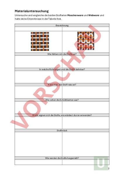 Materialuntersuchung Untersuche und vergleiche die beiden Stoffarten Maschenware und Webware und halte deine Erkenntnisse in der Tabelle fest. Bezeichnung Wie fühlen sich die Stoffe an? In welche Richtungen sind die Stoffe dehnbar? Kann man den Stoff reissen? Wie sehen die Schnittkanten aus? Wofür eignen sich die Stoffe, wie würdest du sie verwenden? Stoffstück Wie werden die Stoffe hergestellt? 2