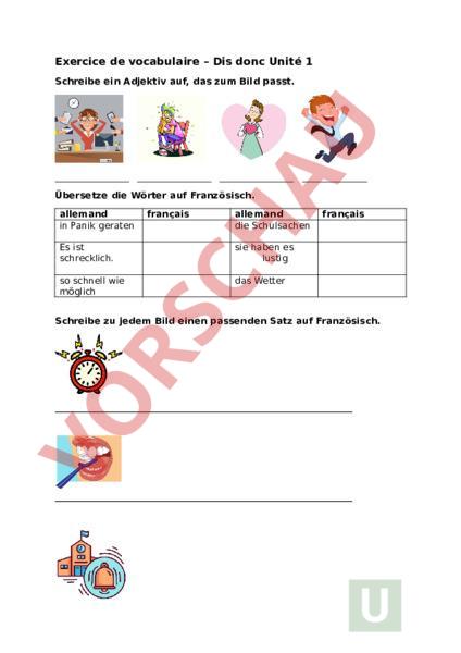 Exercice de vocabulaire – Dis donc Unité 1 Schreibe ein Adjektiv auf, das zum Bild passt. Übersetze die Wörter auf Französisch. allemand in Panik geraten français allemand die Schulsachen Es ist schrecklich. sie haben es lustig so schnell wie möglich das Wetter français Schreibe zu jedem Bild einen passenden Satz auf Französisch. Übersetze die Sätze auf Französisch. Am Morgen trödle ich und vergesse die Zeit. Ich gehe zu Fuss. Sie kommt zu spät in der Schule an. Die Eltern streiten sich. Wir entschuldigen uns und beeilen uns. Ich übe für den Englischtest. Er macht seinen Rucksack schnell bereit. Sie hat Angst auf dem Schulweg. Der Bruder rasiert sich. Ihr sucht die Kollegin.