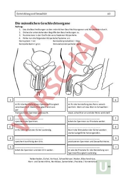 # Entwicklung!und!Sexualität!! ! # Die#männlichen#Geschlechtsorgane# A3! Auftrag:! 1. Lies(die(Beschreibungen(zu(den(männlichen(Geschlechtsorganen(und(Körperteilen(durch.( 2. Ordne(die(unterstehenden(Begriffe(den(Beschreibungen(zu.( 3. Nummeriere(in(der(Grafik(die(verschiedenen(Körperteile.(( 4. Färbe(nun(die(folgenden(Körperteile/Systeme((an:( Harnsystem((rot( ( Keimzellenproduktion((blau( Keimzellenbahn(grün( Stimulationskörperteile(gelb( 1! 2! 3! 4! 5! .! ( ist(für(die(Herstellung(von(Spermienflüssigkeit(( verantwortlich.(Diese(Flüssigkeit(wird(zum(( per( Transport(der(Spermien(gebraucht.( ( .! ! speichern(die(Spermien.( ( ! ! ( ( ( ( ist(für(den(Schutz(der(Eichel(zuständig.( ( ! ! ( ( ( ( ( ( speichert(kurzfristig(den(Urin.( ( ( ! ( leitet(die(Spermien(und(den(Urin(weiter.( ! ! ( ( .( ist(für(die(Versteifung(des(Penis(verantA( wortlich.(Weil(sich(das(Blut(im(SchwellkörA staut,(schwillt(er(an(und(der(Penis(wird(steif.( ! leitet(die(Spermien(zur(Prostata(weiter.( ( Durch(die(Stimulation(der(Eichel(werden(( starke(Lustgefühle(hervorgerufen.( 7! 8! ( produzieren(Spermien(und(Sexualhormone.( 9! ( ist(wie(die(Prostata(für(die(Herstellung(von(( Spermienflüssigkeit(zuständig.(( 10! Nebenhoden,(Eichel,(Vorhaut,(Schwellkörper,(Hoden,(Bläschendrüse,( HarnA(und(Samenröhre,(Harnblase,(Samenleiter,(Prostata(/(Vorstehdrüse! 6! 80! Entwicklung!und!Sexualität!! ! # Die#weiblichen#Geschlechtsorgane# A4! Auftrag: 1. Lies!dir!die!Beschreibungen!zu!den!weiblichen!Geschlechtsorganen!durch.! 2. Ordne!die!unterstehenden!Begriffe!den!Beschreibungen!zu.! 3. Nummeriere!in!der!Grafik,!passend!zu!den!Beschreibungen,!die!verschiedenen!Organe!.! 4. Färbe!nun!die!folgenden!Körperteile/Systeme!!an:! Harnsystem!!rot! ! Keimzellenproduktion!!blau! Keimzellenbahn!grün! Stimulationskörperteile!gelb! 5. Vergleiche!nun!die!angefärbten!weiblichen!Körperteile!und!Systeme!mit!den!! männlichen.! Welche!Unterschiede!und!Gemeinsamkeiten!kannst!du!feststellen?! # # # # # # # 1! 2! 3! 4! 5! .## # # nimmt!die!befruchtete!Eizelle!auf.!In!ihr!! ! leitet!das!befruchtete!Ei!zur!! kann!sich!die!Eizelle!bis!hin!zur!Geburt! ! Gebärmutter!weiter.!! entwickeln.!Durch!Wehen!wird!die!Geburt!eingeleitet.! # .## # # Nimmt!den!Penis!und!die!Spermien!während!des!!! dient!zu!Stimulation!und!sorgt!für!! Geschlechtsverkehrs!auf!und!ermöglicht!den!Ausfluss!! starke!Lustgefühle.! der!Menstruation.!Zudem!dient!sie!als!Geburtskanal.! # ## # # speichert!kurzfristig!den!Urin! ! ! schützen!die!Geschlechtsorgane!vor!! # # ! ! Fremdeinflüssen!! ## # # verschliesst!die!Gebärmutter!mithilfe!eines!Ringmuskels! produziert!die!Eizellen!und!die!! # # # ! Sexualhormone.!# # # # .# schützen!die!Geschlechtsorgane!vor!Fremdeinflüssen! leitet!den!Urin!weiter.! Klitoris,!Harnblase,!Gebärmutter,!äussere!Schamlippen,!Harnröhre,!! Eileiter,!Eierstock,!Scheide,!innere!Schamlippen,!Gebärmuttermund# 6! 7! 8! 9! 10# 83!