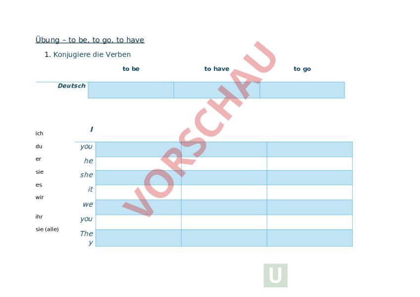 Übung – to be, to go, to have 1. Konjugiere die Verben to be Deutsch ich du you er he sie es wir ihr sie (alle) she it we you The to have to go