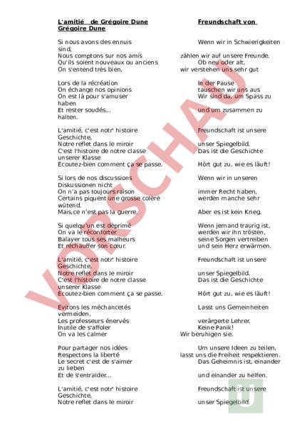Lamitié de Grégoire Dune Grégoire Dune Freundschaft von Si nous avons des ennuis sind, Nous comptons sur nos amis Quils soient nouveaux ou anciens On sentend très bien, Wenn wir in Schwierigkeiten zählen wir auf unsere Freunde. Ob neu oder alt, wir verstehen uns sehr gut Lors de la récréation On échange nos opinions On est là pour samuser haben Et rester soudés. halten. In der Pause tauschen wir uns aus Wir sind da, um Spass zu Lamitié, cest notr histoire Geschichte, Notre reflet dans le miroir Cest lhistoire de notre classe unserer Klasse Écoutez-bien comment ça se passe. Freundschaft ist unsere Si lors de nos discussions Diskussionen nicht On na pas toujours raison Certains piquent une grosse colère wütend. Mais,ce nest pas la guerre. Wenn wir in unseren Si quelquun est dèprimé On va le réconforter Balayer tous ses malheurs Et réchauffer son cœur. Wenn jemand traurig ist, werden wir ihn trösten, seine Sorgen vertreiben und sein Herz erwärmen. Lamitié, cest notr histoire Geschichte, Notre reflet dans le miroir Cest lhistoire de notre classe unserer Klasse Écoutez-bien comment ça se passe. Freundschaft ist unsere Évitons les méchancetés vermeiden, Les professeurs énervés Inutile de saffoler On va les calmer Lasst uns Gemeinheiten Pour partager nos idées Respectons la liberté Le secret cest de saimer zu lieben Et de sentraider. Lamitié, cest notr histoire Geschichte, Notre reflet dans le miroir und um zusammen zu unser Spiegelbild. Das ist die Geschichte Hört gut zu, wie es läuft! immer Recht haben, werden manche sehr Aber es ist kein Krieg. unser Spiegelbild. Das ist die Geschichte Hört gut zu, wie es läuft! verärgerte Lehrer. Keine Panik! Wir beruhigen sie. Um unsere Ideen zu teilen, lasst uns die Freiheit respektieren. Das Geheimnis ist, einander und einander zu helfen. Freundschaft ist unsere unser Spiegelbild. Cest lhistoire de notre classe unserer Klasse Écoutez-bien comment ça se passe. Das ist die Geschichte Lamitié, cest votre histoire Geschichte, Votre reflet dans le miroir Le message de notr espoir Hoffnung, Gardez le bien. en mémoire Lamitié Freundschaft! Freundschaft ist eure Hört gut zu, wie es läuft! euer Spiegelbild. Die Botschaft unserer bewahre sie in Erinnerung: