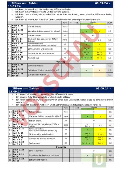 Ziffern und Zahlen 13.09.24 Ich kann Ich kann Ich kann werden. Ich kann 09.09.24 – Zahlen durch Umstellen der Ziffern verändern. in Schritten vorwärts und rückwärts zählen. beschreiben, wie sich der Wert einer Zahl verändert, wenn einzelne Ziffern verändert Zahlen durch Addieren und Subtrahieren von Zehnerpotenzen verändern. Form Buch S. 20 1E Nr. 1 Buch S. 20 2 Nr. 2 Buch S. 20 3 Nr. 3 Heft S. 14 4 Nr. 1 2 Buch S. 21 5E Nr. 4 Heft S. 15 6 Nr. 3 4 Heft S. 16 7 Nr. 5 6 Buch S. 22 8E Nr. 7 8 Zahlen bilden. Klasse Wie viele Zahlen kannst du bilden? Klasse Zahlen bilden. verb. Niveau aa Bilde mit den gegebenen Ziffern Zahlen. LK alle LK LK alle LK /SK 1 2a b 1, 2 LK Zahlen verändern. Achte auf eine schöne Darstellung. LK Zähle vorwärts und rückwärts 3a b 4a 34 SK Schreibe die Rechenschritte auf. 5a b 6a 5b c 6a b SK Rechne aus. 7a b e f 8b c LK Freiwillig Buch S. 22 Nr. 6 Buch S. 22 10 Nr. 9 Buch S. 23 11 Nr. 10 9 Zähle in Schritten Schreiben die Rechenschritte auf. Zahlenkombination Ich kann Ich kann Ich kann werden. Ich kann 09.09.24 – Zahlen durch Umstellen der Ziffern verändern. in Schritten vorwärts und rückwärts zählen. beschreiben, wie sich der Wert einer Zahl verändert, wenn einzelne Ziffern verändert Zahlen durch Addieren und Subtrahieren von Zehnerpotenzen verändern. Form Buch S. 20 1E Nr. 1 Buch S. 20 2 Nr. 2 Buch S. 20 3 Nr. 3 Heft S. 14 4 Nr. 1 2 Buch S. 21 5E Nr. 4 Heft S. 15 6 Nr. 3 4 Heft S. 16 7 Nr. 5 6 Buch S. 22 8E Nr. 7 8 LK LK Ziffern und Zahlen 13.09.24 LK alle Zahlen bilden. Klasse Wie viele Zahlen kannst du bilden? Klasse Zahlen bilden. verb. Niveau LK /SK LK alle LK LK alle Bilde mit den gegebenen Ziffern Zahlen. aa 1 2a b 1, 2 LK Zahlen verändern. Achte auf eine schöne Darstellung. LK Zähle vorwärts und rückwärts 3a b 4a 34 SK Schreibe die Rechenschritte auf. 5a b 6a 5b c 6a b SK Rechne aus. 7a b e f 8b c LK Freiwillig Buch S. 22 Nr. 6 Buch S. 22 10 Nr. 9 Buch S. 23 11 Nr. 10 9 Zähle in Schritten Schreiben die Rechenschritte auf. Zahlenkombination LK alle LK LK