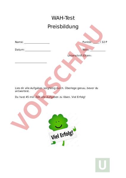 WAH-Test Preisbildung Name: Punkte: 32 Datum: Note: Unterschrift Eltern: Lies dir alle Aufgaben sorgfältig durch. Überlege genau, bevor du antwortest. Du hast 45 min Zeit alle Aufgaben zu lösen. Viel Erfolg! Aufgabe 1: Kreuze die richtigen Aussagen an. a) Was ist der Preis? Kreuze an. Der Lohn, den man für seine Arbeit bekommt. Der Betrag, den man für ein Produkt oder eine Dienstleistung bezahlen muss. Die Anzahl der Produkte in einem Geschäft. b) Zwei Einflüsse auf die Preisbildung sind: (2 aus 4 richtig – je 1 P) Die Nachfrage nach einem Produkt. Das Wetter an einem einzelnen Tag. Das Angebot eines Produkts. Die Farbe der Verpackung. c) Wenn die Produktion von einem Produkt teurer wird, dann (2 aus 4 richtig – je 1 P) wird der Preis in vielen Fällen erhöht. kann sie die Qualität verbessern. verdient der Verkäufer dadurch mehr Geld. kann es sein, dass weniger Menschen das Produkt kaufen. P. 5 P. Aufgabe 2: Zuordnungsaufgabe Verbinde die Begriffe mit den dazu passenden Erklärungen. Begriff Erklärung Angebot Eine Verpackung eines Produkts. Nachfrage Wie viele Menschen ein Produkt kaufen möchten. Preis Wenn mehrere Firmen dasselbe Produkt verkaufen und um Kunden kämpfen Wettbewerb Die Menge eines Produkts, die Unternehmen zu einem bestimmten Preis verkaufen möchten. Der Betrag, den man für ein Produkt zahlt P. 4 P. Aufgabe 3: Lückentext Setze die passenden Wörter ein. Wähle aus: Angebot – Nachfrage – Preis – sinkt – steigen – Wettbewerb Wenn das grösser ist als die Nachfrage, dann der Preis. Wenn viele Firmen ähnliche Produkte verkaufen, spricht man von. Wenn diesteigt, dann kann der auch. P. 6 P. Aufgabe 4: Richtig oder falsch? Kreuze an, ob die Aussagen stimmen oder nicht stimmen. Aussage Stimmt Stimmt nicht Wenn viele Leute ein Produkt kaufen wollen, steigt der Preis. Ein altes oder beschädigtes Produkt ist meist günstiger. Wenn viele Anbieter dasselbe Produkt verkaufen, sinkt der Preis. Preisveränderungen beeinflussen das Kaufverhalten. P. 4 P. Aufgabe 5: Fallbeispiel „Tomaten Im Sommer sind Schweizer Tomaten sehr günstig. Viele Bauern haben eine gute Ernte. a) Erkläre mit eigenen Worten, warum Tomaten bei einer grossen Ernte günstiger werden. (2 P) b) Stell dir vor, es gibt keine Schweizer Tomaten. Was könnte dann mit dem Preis passieren? Begründe deine Antwort. (2 P) P. 4 P. Aufgabe 6: Wettbewerb und Werbung im Alltag a) Was passiert mit dem Preis, wenn viele Anbieter dasselbe Produkt verkaufen? Denk z. B. an Supermärkte oder Läden mit ähnlichen Angeboten. Schreibe 2-3 Sätze. b) Wie kann Werbung beeinflussen, ob jemand ein Produkt kauft oder nicht? Denk z.B. an Werbung für Snacks, Marken-Kleidung oder Handys. Schreibe 2-3 Sätze. P. 6 P. Aufgabe 7: Eigene Erfahrung mit Preisen Denk an ein Produkt, das du oder deine Familie oft kauft: z. B. Sonnenblumenöl, Gemüse, Strom, Benzin, Brot, Käse, ein Abo a) Hast du schon erlebt, dass der Preis plötzlich gestiegen oder gesunken ist? b) Warum hat sich der Preis verändert (z. B. Wetter, Krieg, Saison, Energiepreise, Inflation)? c) Was habt ihr dann gemacht? Habt ihr z.B. weniger davon gekauft oder ein anderes Produkt genommen? Schreibe 2–3 Sätze. P. 3 P.